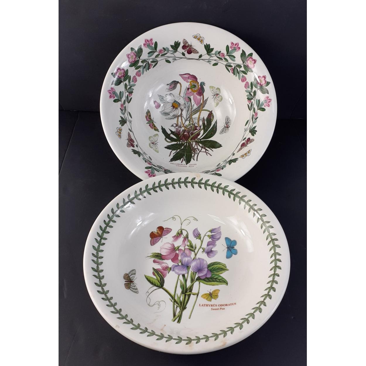 PORTMEIRION Ceramics - Two bowls in Botanic Garden ange. One a shallow bowl with SWEET PEA pattern and a deeper 28cm bowl in CHRISTMAS ROSE pattern. Both in good condition.