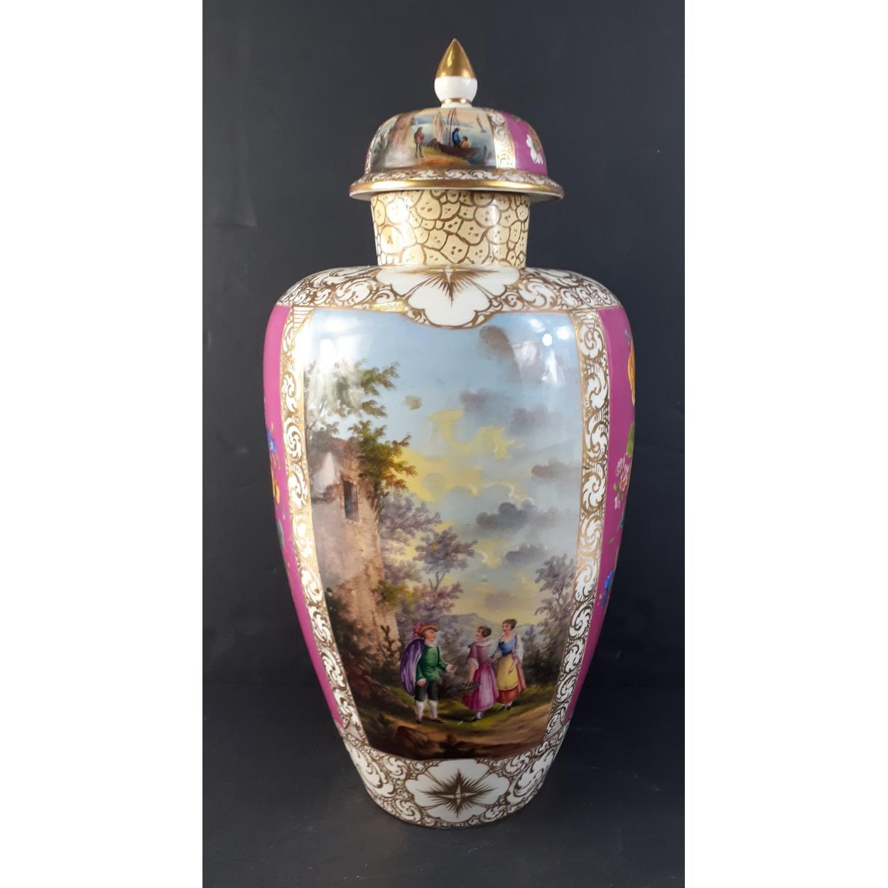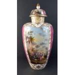 A large lidded vase in the Italianate pattern with gilt accents and crossed blue swords to base, stands approx 42cm high. The neck of the vase has been damaged but skillfully repaired