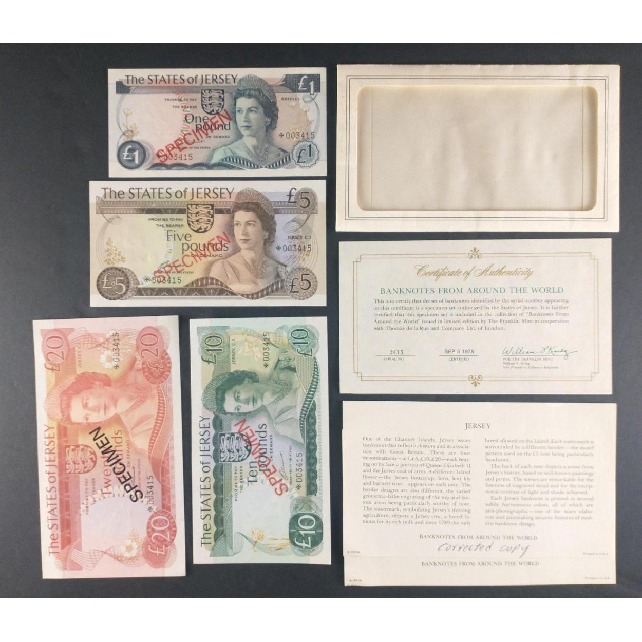 The STATES of JERSEY SPECIMEN Banknote set in holder with Limited Edition Certificate from 1978 to include £1, £5, £10, £20 in crisp condition. All star notes matching 003415 as noted on certificate