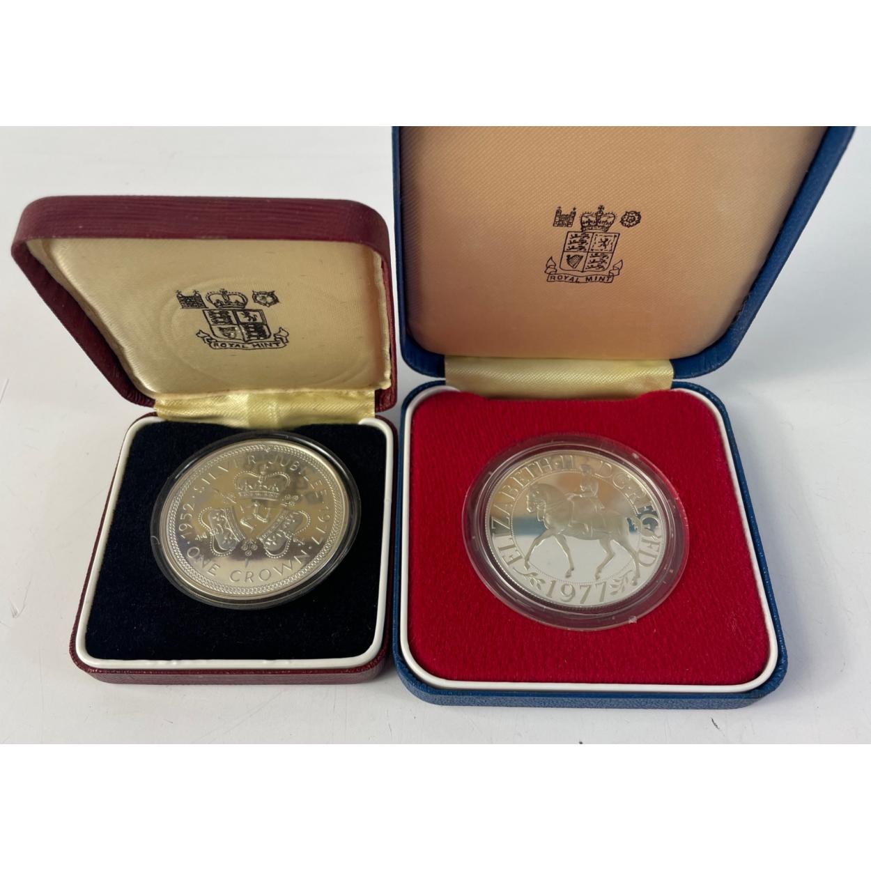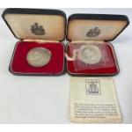 1972 Isle of Man silver proof 1 One Crown coins x2 in cases. One coin still in packet and with paperwork. Other with toning, minor wear to cases.