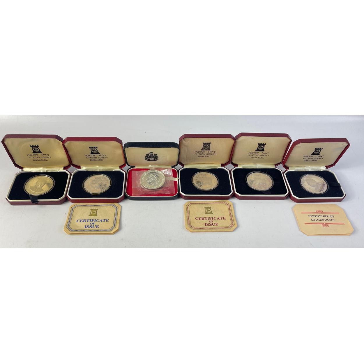 Six ISLE OF MAN silver proof coins being one crown Centenary of the Horse Tram 1976, one crown Bicentenary of US Independence 1976, one crown Queen's Silver Jubilee Appeal, all with certificates of issue, also one crown Winston Churchill Centenary 1874-1974, twenty five pence 1975, and the Silver Wedding Anniversary 1977 five pence