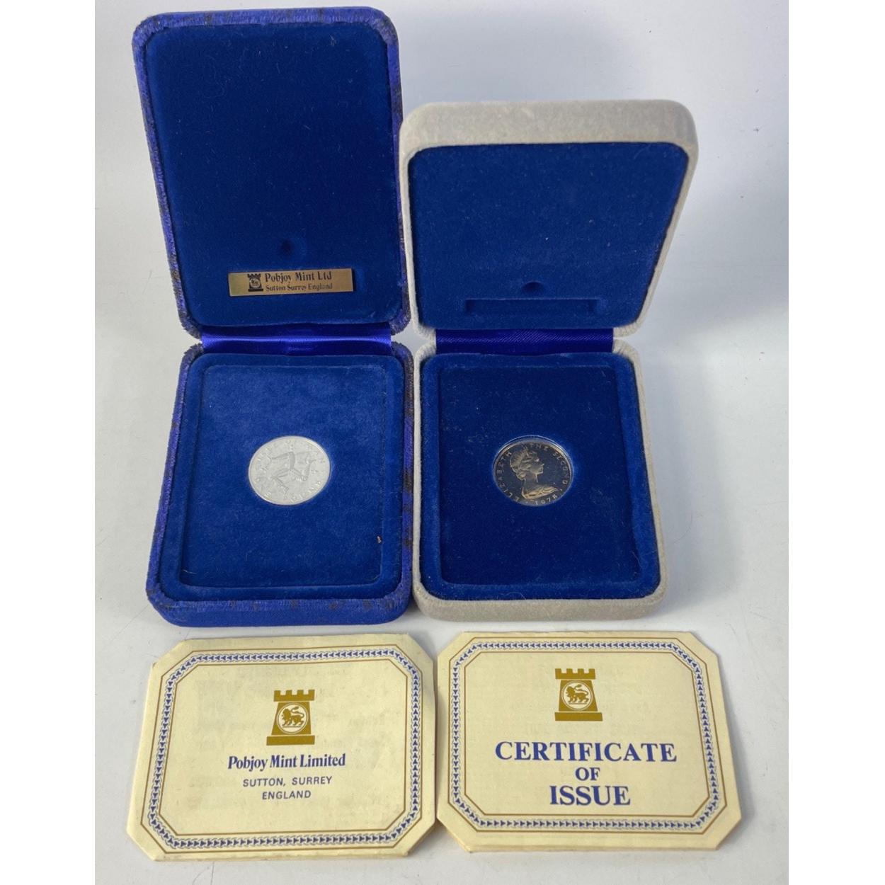 Two ISLE OF MAN silver proof one pound coins in presentation cases both with certificates from the Pobjoy Mint, Surrey,