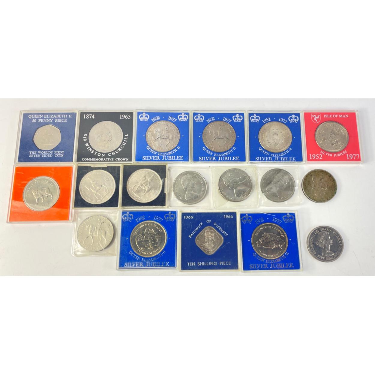 Various cased coins including 3 silver jubilee coins, a QEII 50 pence piece, a Churchill commemorative coin, plus Channel Island cased coins including Jersey silver jubilee, Guernsey ten shilling piece, also Isle of Man silver jubilee, and twenty five pence 1975, plus 4 five shilling coins etc