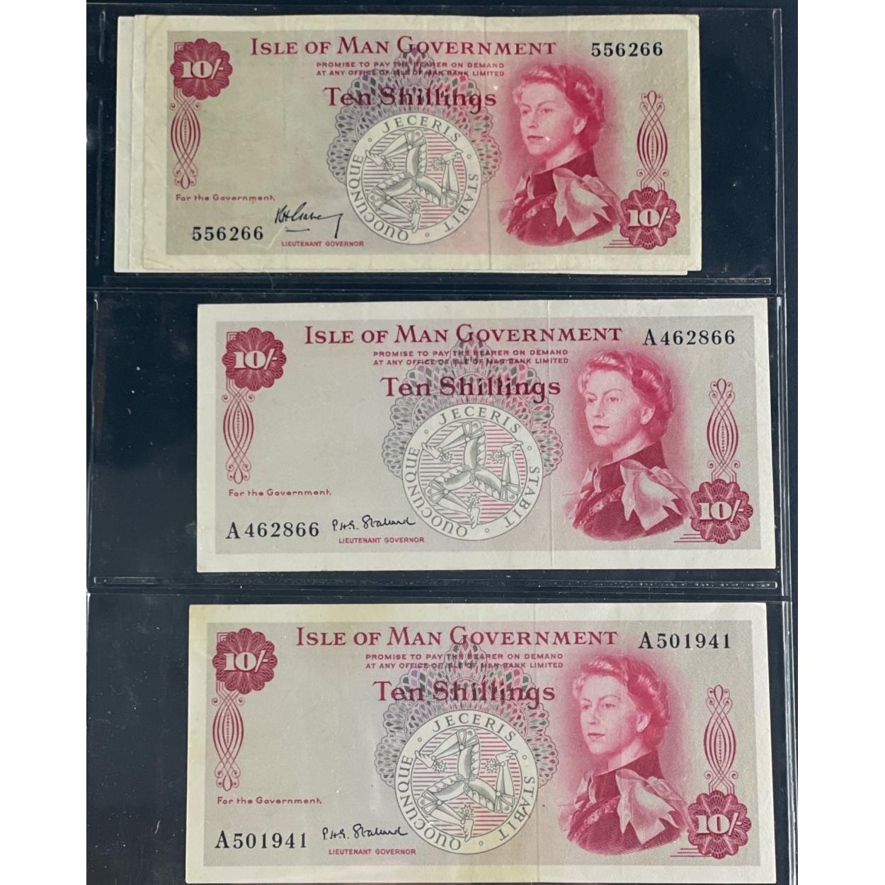 ISLE OF MAN 10/- Banknote selection. Five banknotes to include two 'A' Prefix and three others with interesting double numbers, others are good with light wear.
