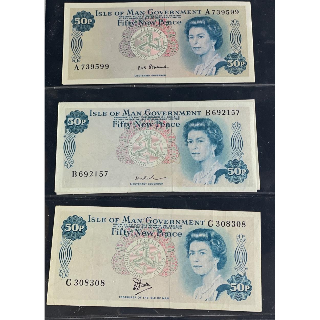 ISLE OF MAN Fifty new pence Banknote selection. Four banknotes to include two 'A' Prefix Notes are good with light wear