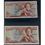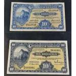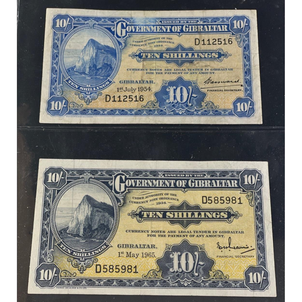 GIBRALTAR Banknotes of interest. A 1954 10/- with wear and a 1965 10/- in good crisp condition.