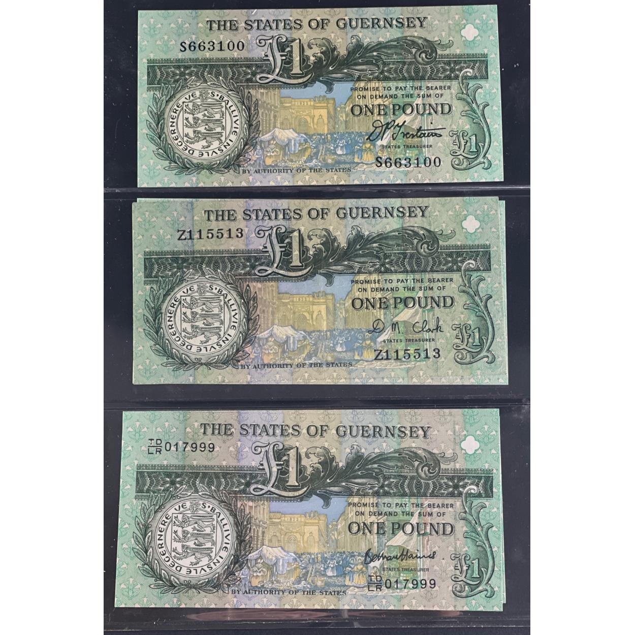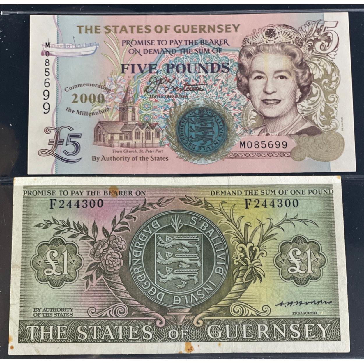 GUERNSEY Banknotes x2 to include Millennium £5 Crisp and UNC and a pre 1975 £1 note with light spotting.