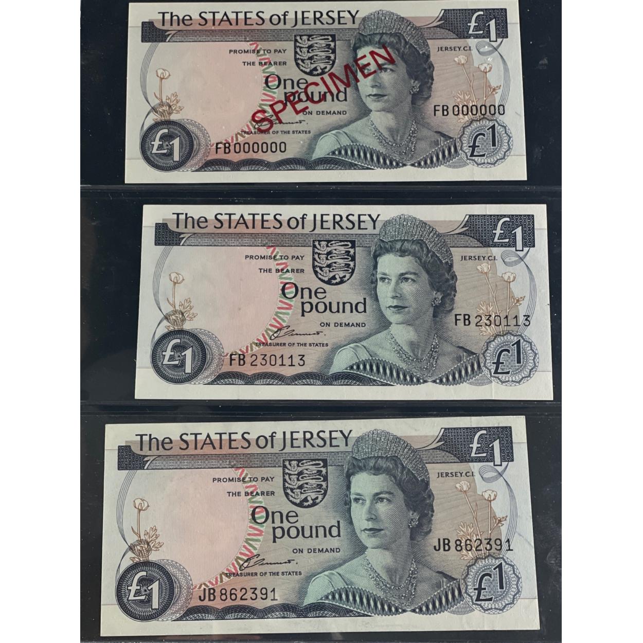 The STATES of JERSEY Banknotes.SPECIMEN £1 note 'FB' Prefix and two others. All UNC.