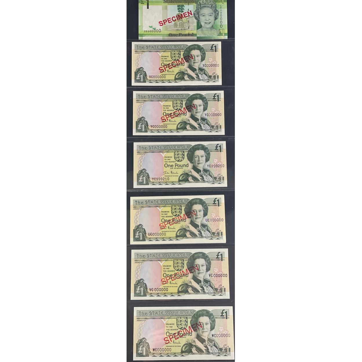 The STATES of JERSEY Banknotes. SPECIMEN £1 note sequential prefixes x 5 and three others. All in excellent UNC condition.