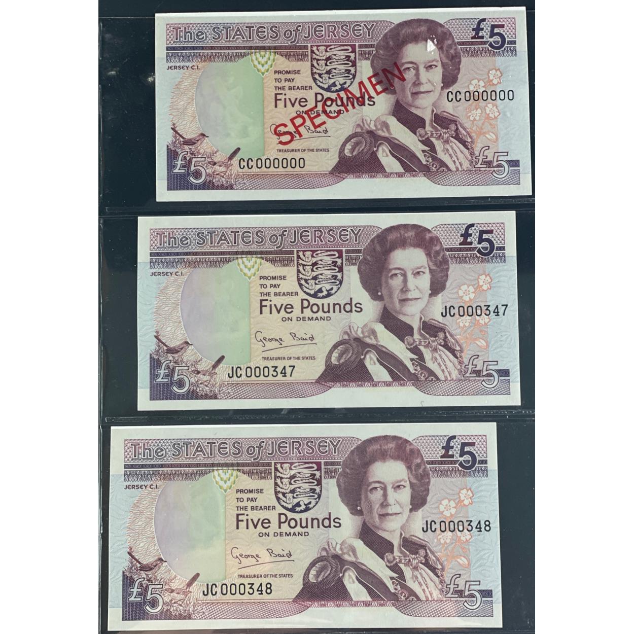The STATES of JERSEY Banknotes. SPECIMEN £5 note 'CC' Prefix, and a sequential pair. All Excellent UNC.
