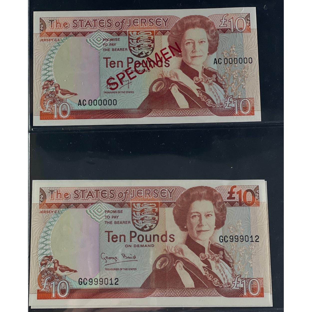 The STATES of JERSEY Banknotes. SPECIMEN £10 notes x2 'AC' / 'NC' Prefixes and one other. All UNC.