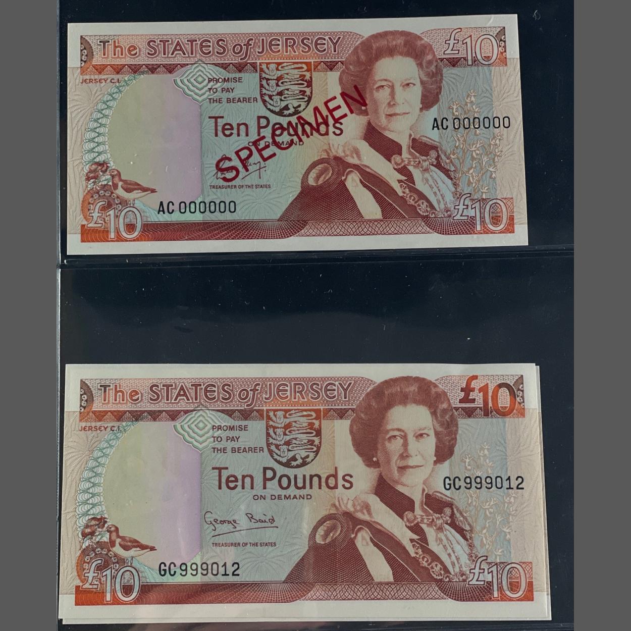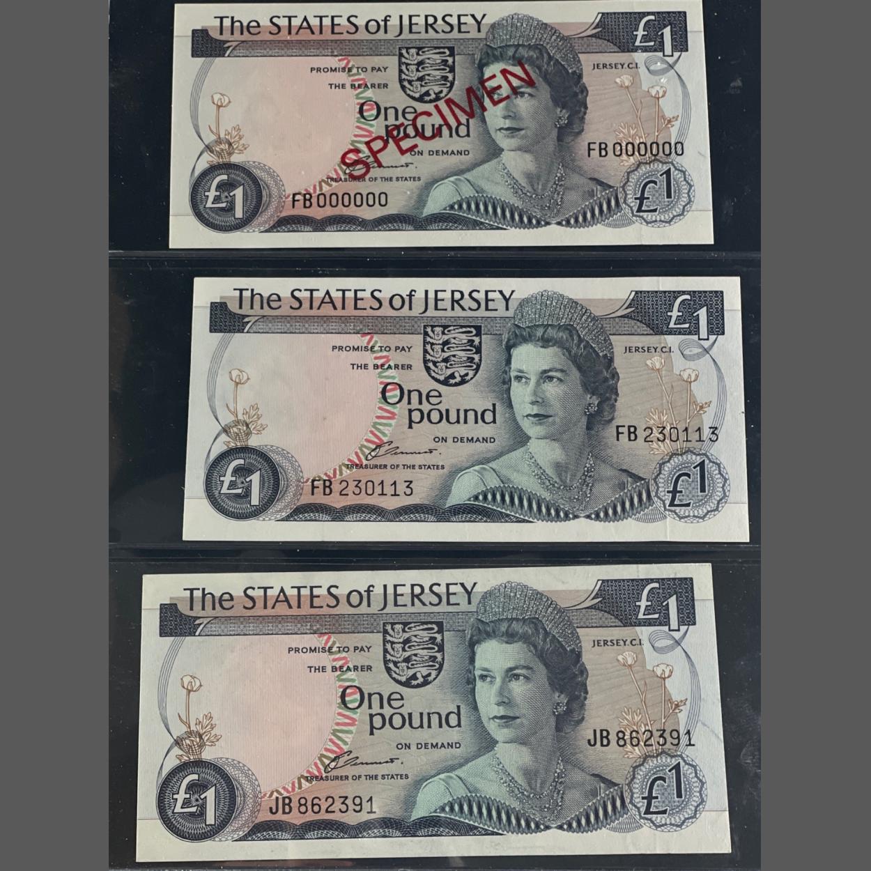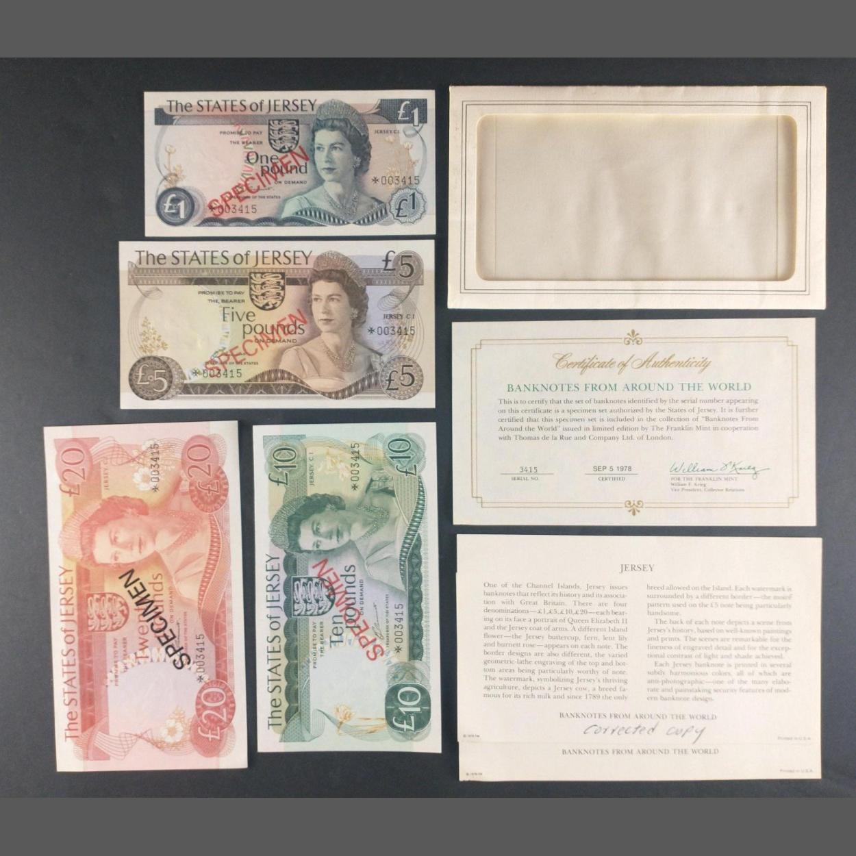 The STATES of JERSEY SPECIMEN Banknote set in holder with Limited Edition Certificate from 1978 to include £1, £5, £10, £20 in crisp condition. All star notes matching 003415 as noted on certificate