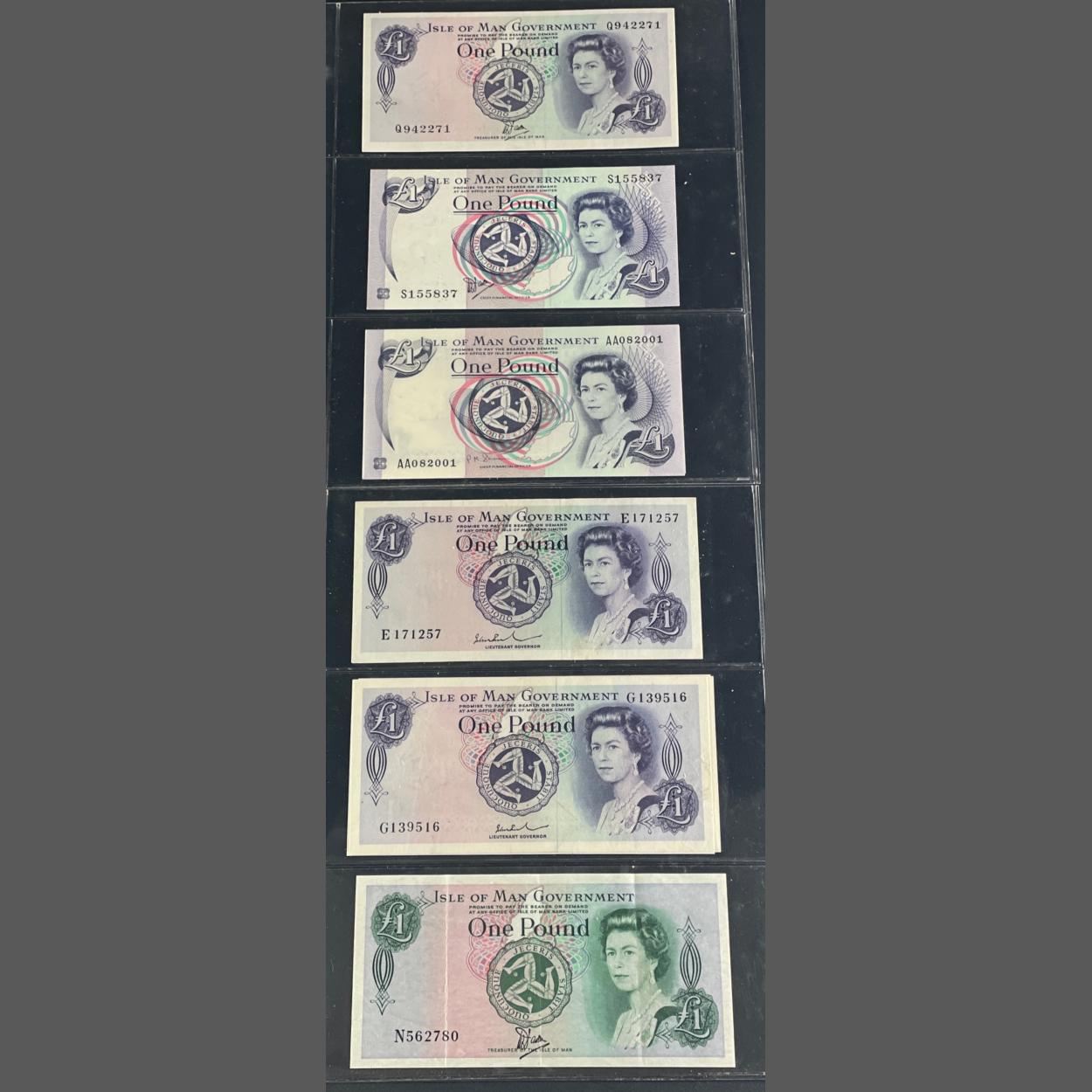 ISLE OF MAN £1 Banknote selection. Eight banknotes to include interesting low numbers. Notes are good with light wear