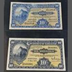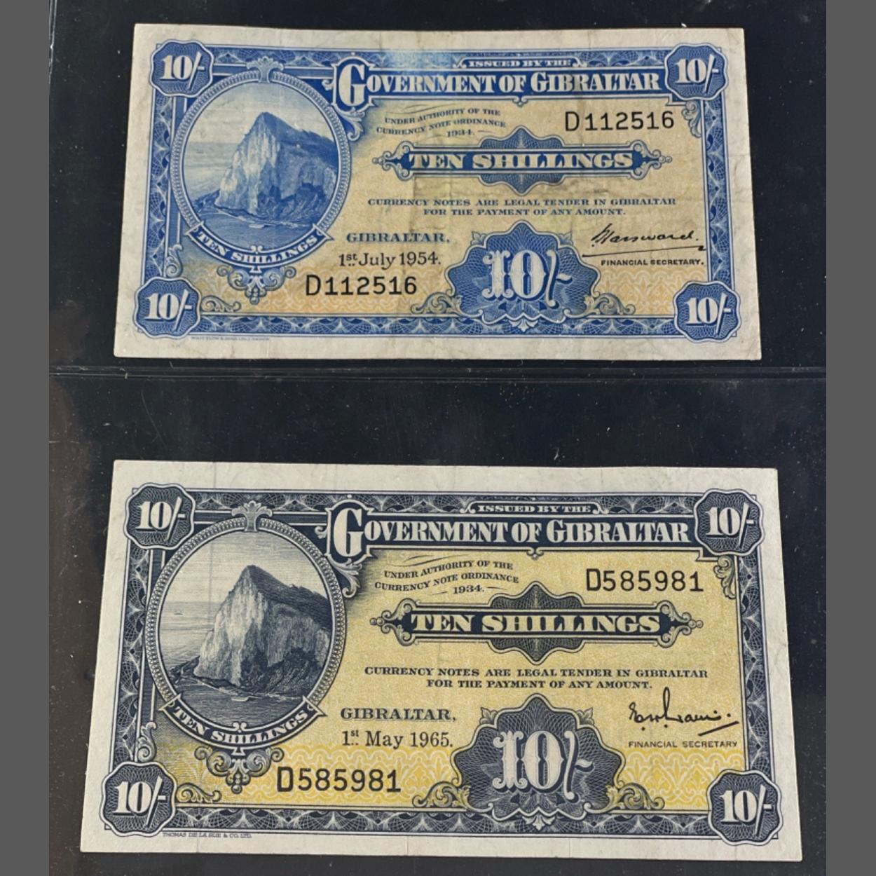 GIBRALTAR Banknotes of interest. A 1954 10/- with wear and a 1965 10/- in good crisp condition.