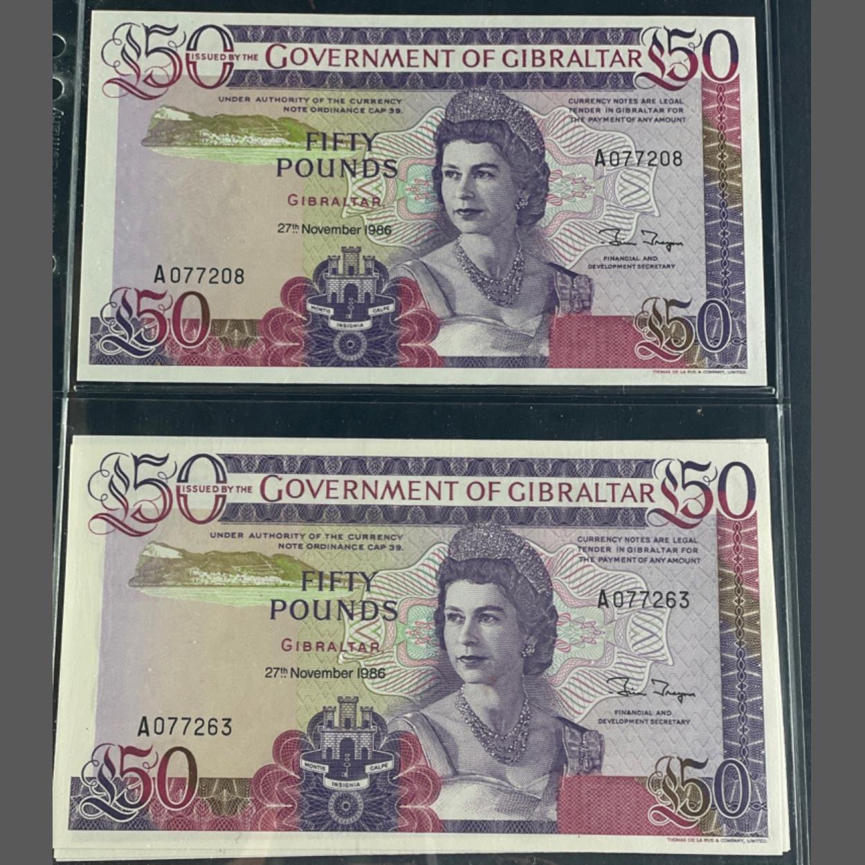 GIBRALTAR Banknotes A sequential series of three 1986 'A' Prefix £50 notes and one other 'A' note. All notes in crisp UNC condition.
