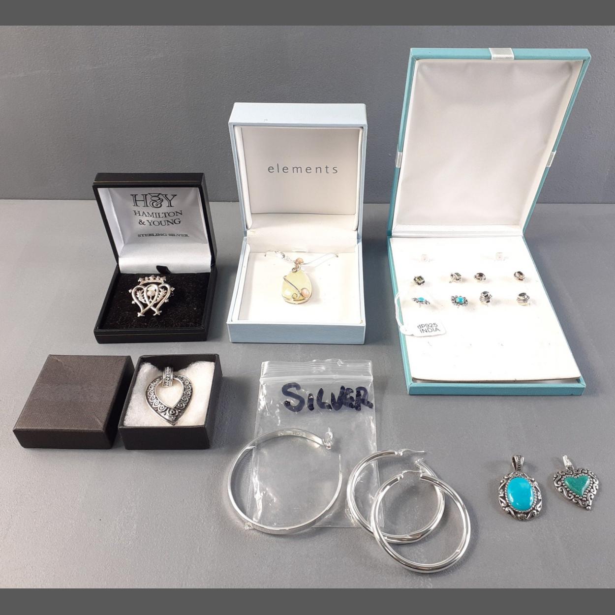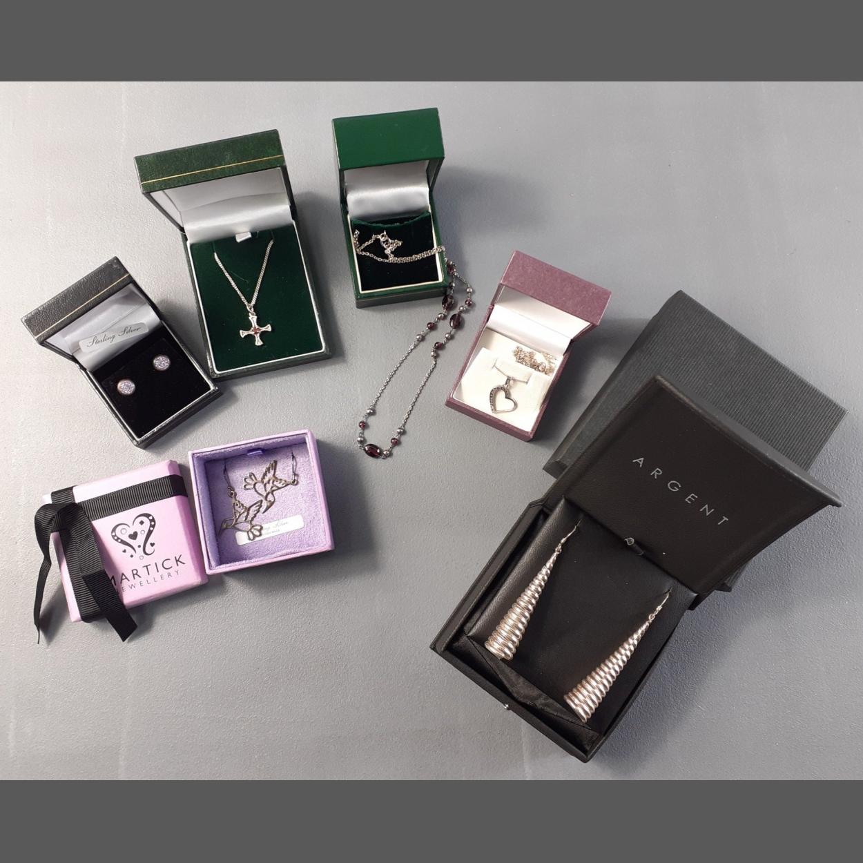 A collection of silver jewellery to include a cross set with small red stone, an open heart set with clear stones, a pair of hoop bird shaped earrings, a pair of sparkly stud earrings, and an impressive pair of hoop cone shaped earrings approx 60mm long etc. All boxed in excellent condition.