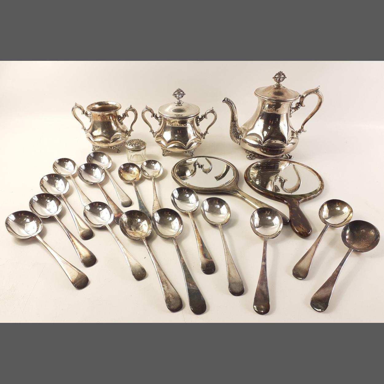 A small silver plate lot to include a tea service by WEBB, soup spoons, hand mirror plus a silver hallmarked bottle.