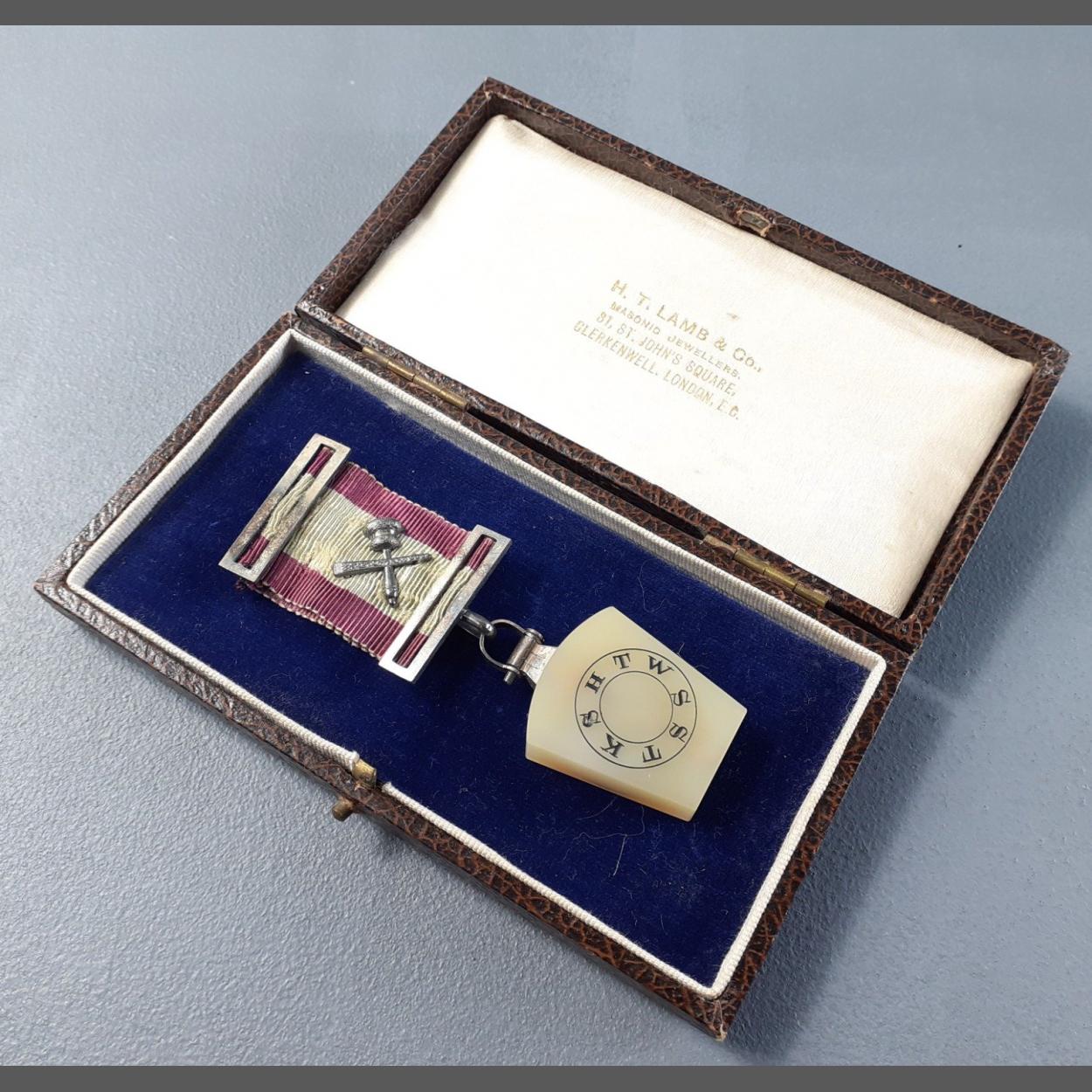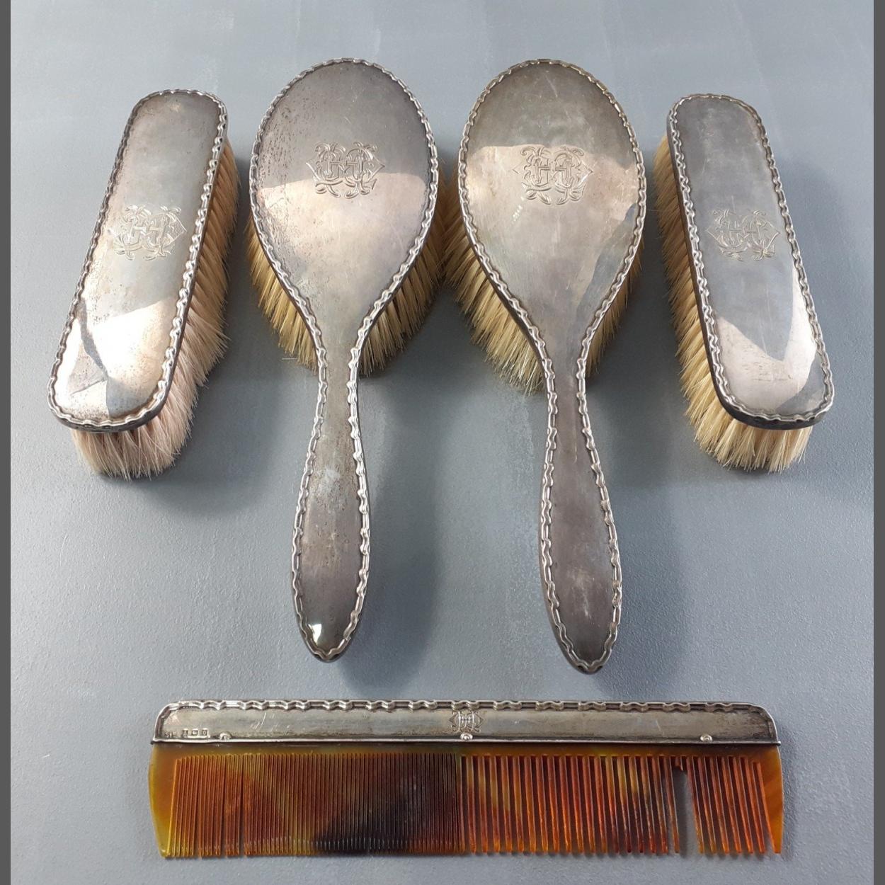 A gent's travelling toiletry set to fit within a suitcase to include 5 silver hallmarked topped glass bottles, 1 clothes brush and 2 small holders stamped 'ink' and 'light'. Delightful throwback to when travel was a pleasure. (Base on one bottle broken)