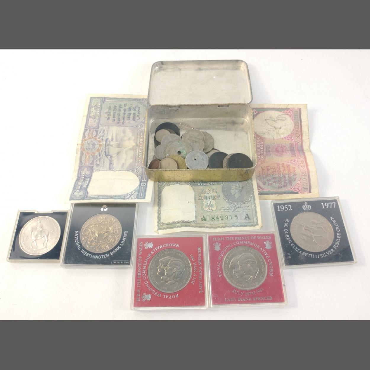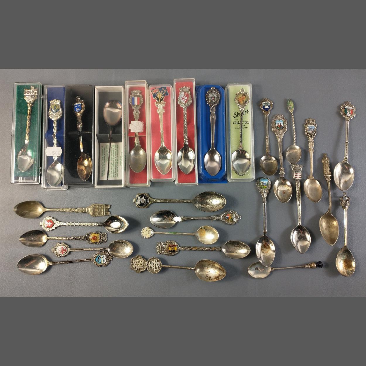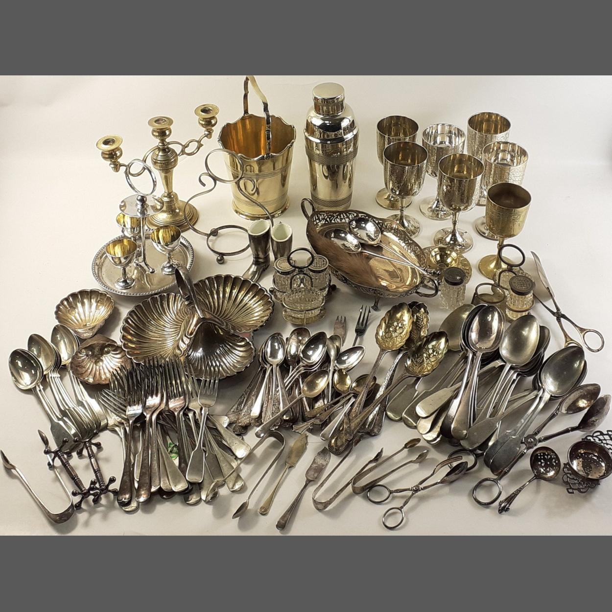 A box of silver plates and metal table ware to include many spoons, forks, other cutlery, condiments, trays, candlestick, ice bucket cocktail shaker, goblets and others.