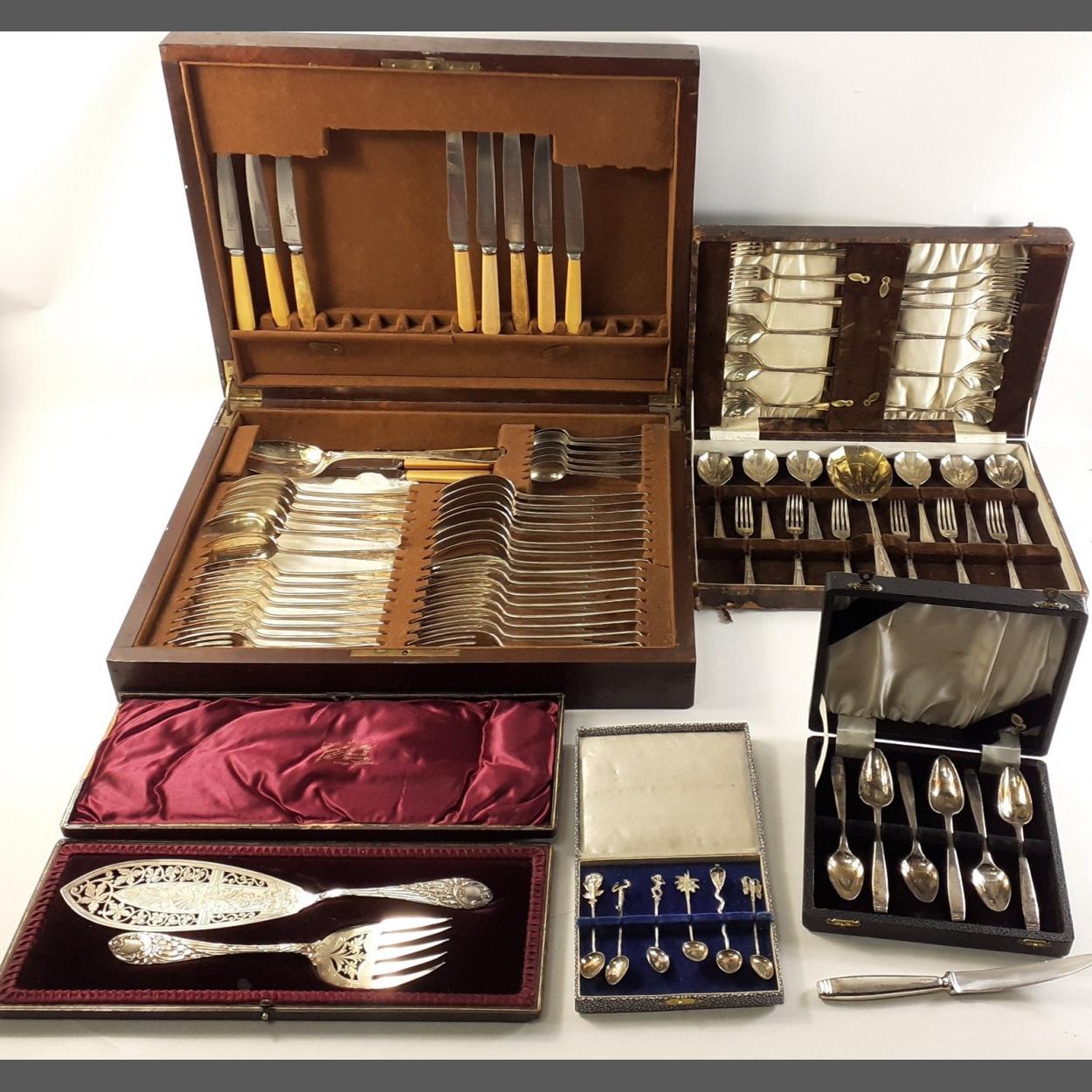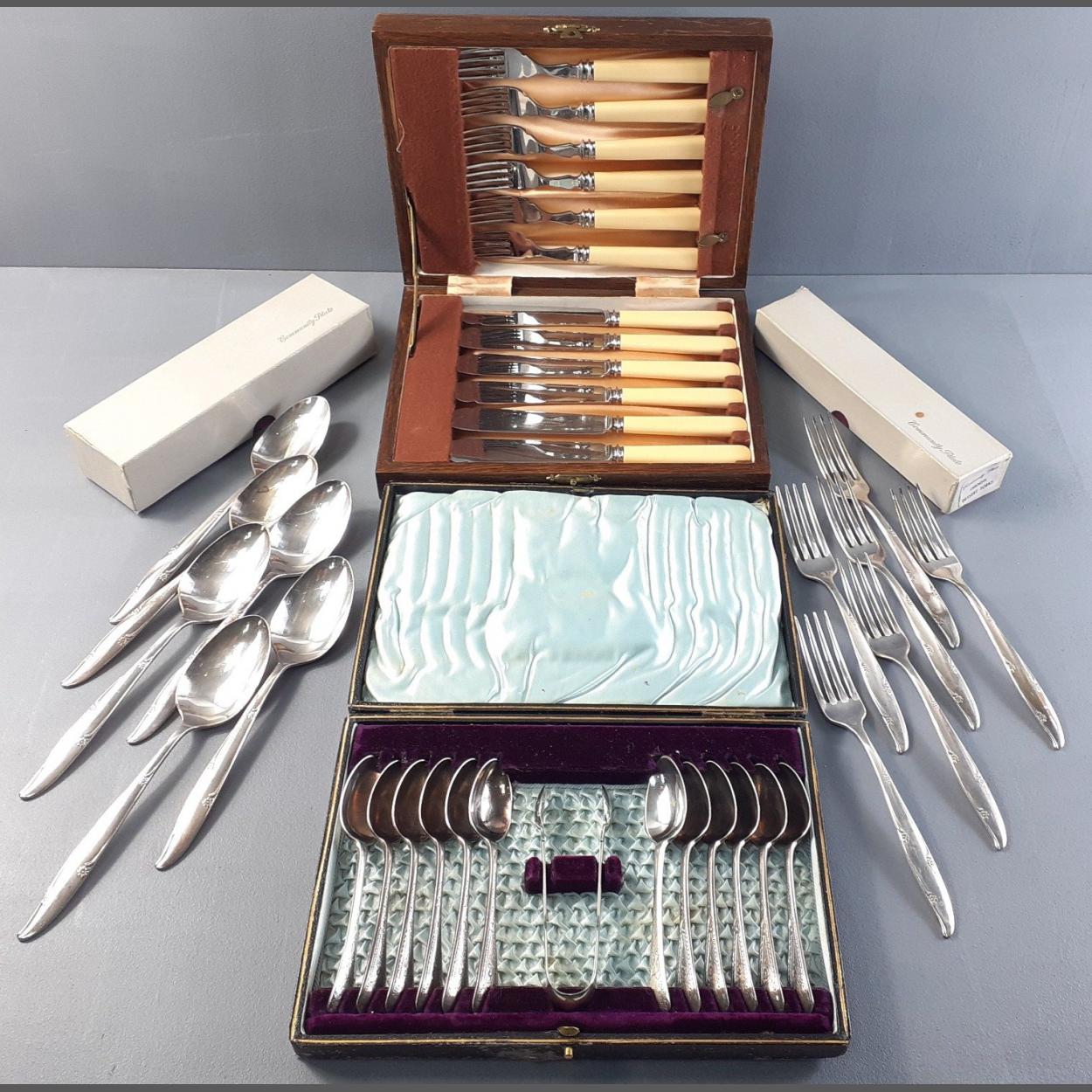 A quantity of plate boxed cutlery with a dozen teaspoons and sugar nips set with also a 6 place setting fish knives and forks set