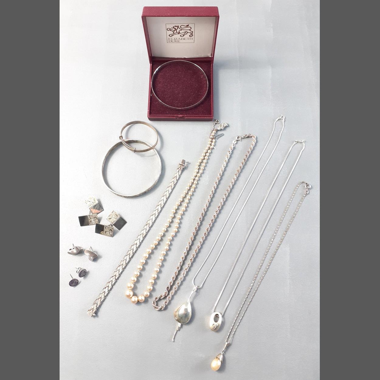 A 925 or sterling marked silver jewellery lot to include pearls with silver clasp, bangles, pendants etc. Gross weight without the pearls 90g approx.