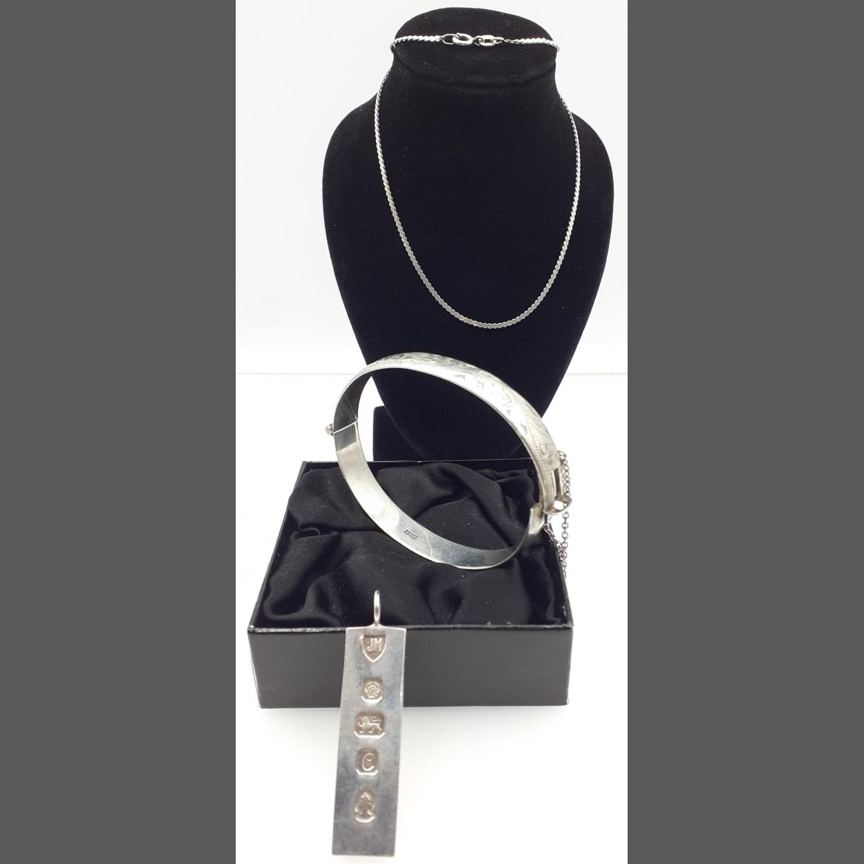UMM A small collection of silver jewellery to include a hallmarked bangle, 40cm and a 1977 hallmarked ingot. Gross weight 47.2g approx