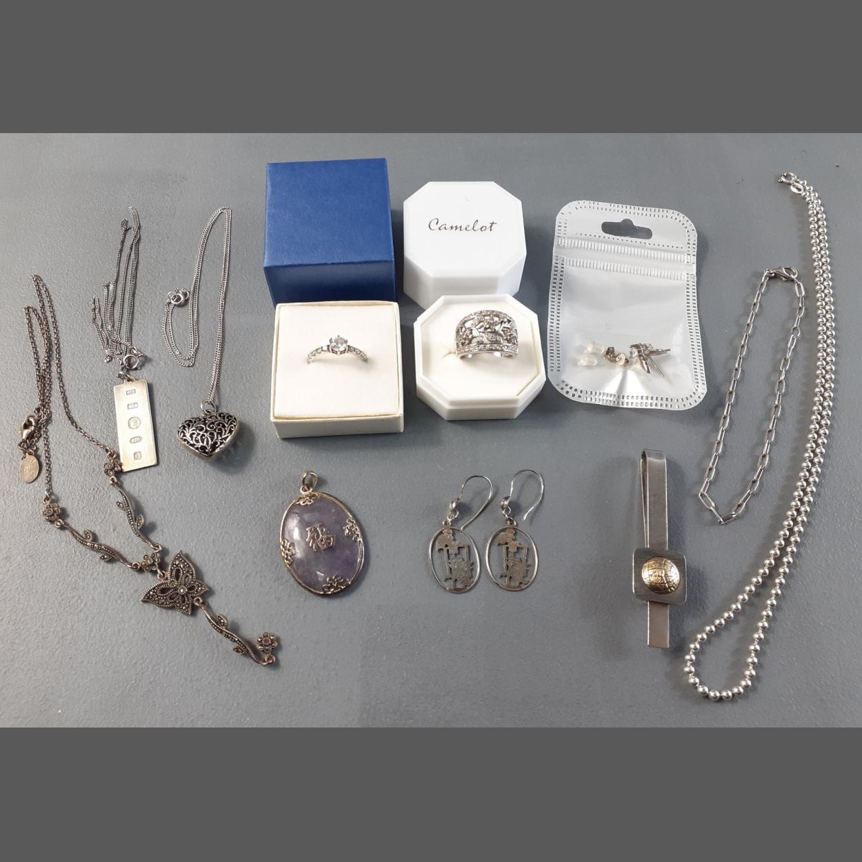 A collection of silver jewellery to include an ingot on a chain, 925 stamped note clip, marcasite necklace, 2 rings size N, chains etc