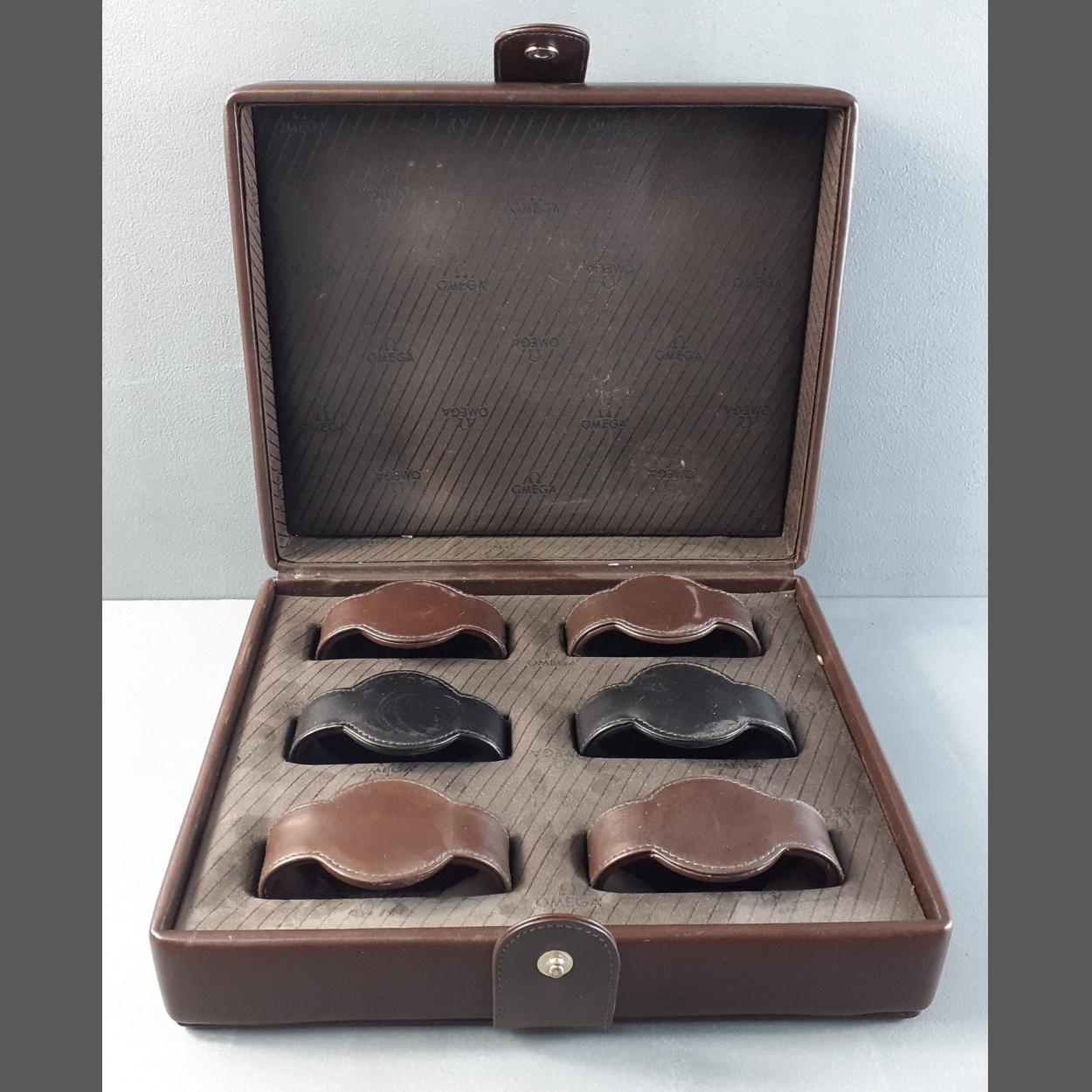 OMEGA WATCHES. Luxury leather six space watch box in dark brown finish. With watch retainers and in good clean, little used condition.