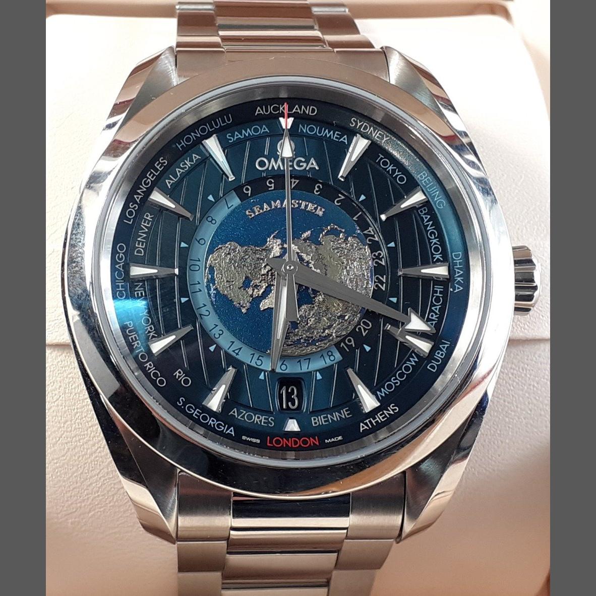 OMEGA SEAMASTER Aqua Terra Master 150M Co-Axial 8938. Reference: 220.12.43.22.03.001 on steel bracelet. Stunning watch, World Timer complete in box with papers (cards) working well at valuation. Over £9000 new!