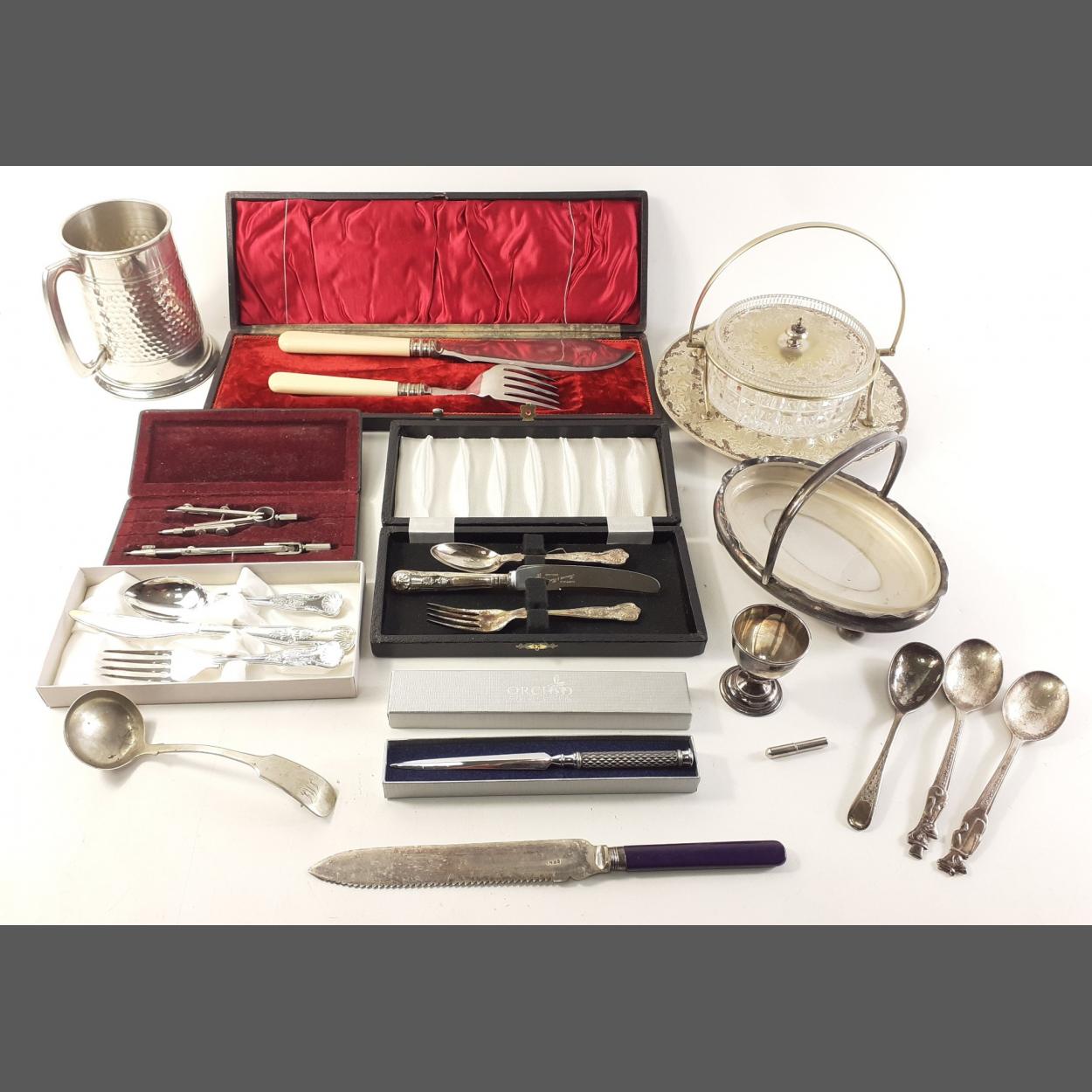 A collection of silver plate to include Victorian serving dish, boxed cutlery, tankard, mixed cutlery etc. An interesting lot of silver plate