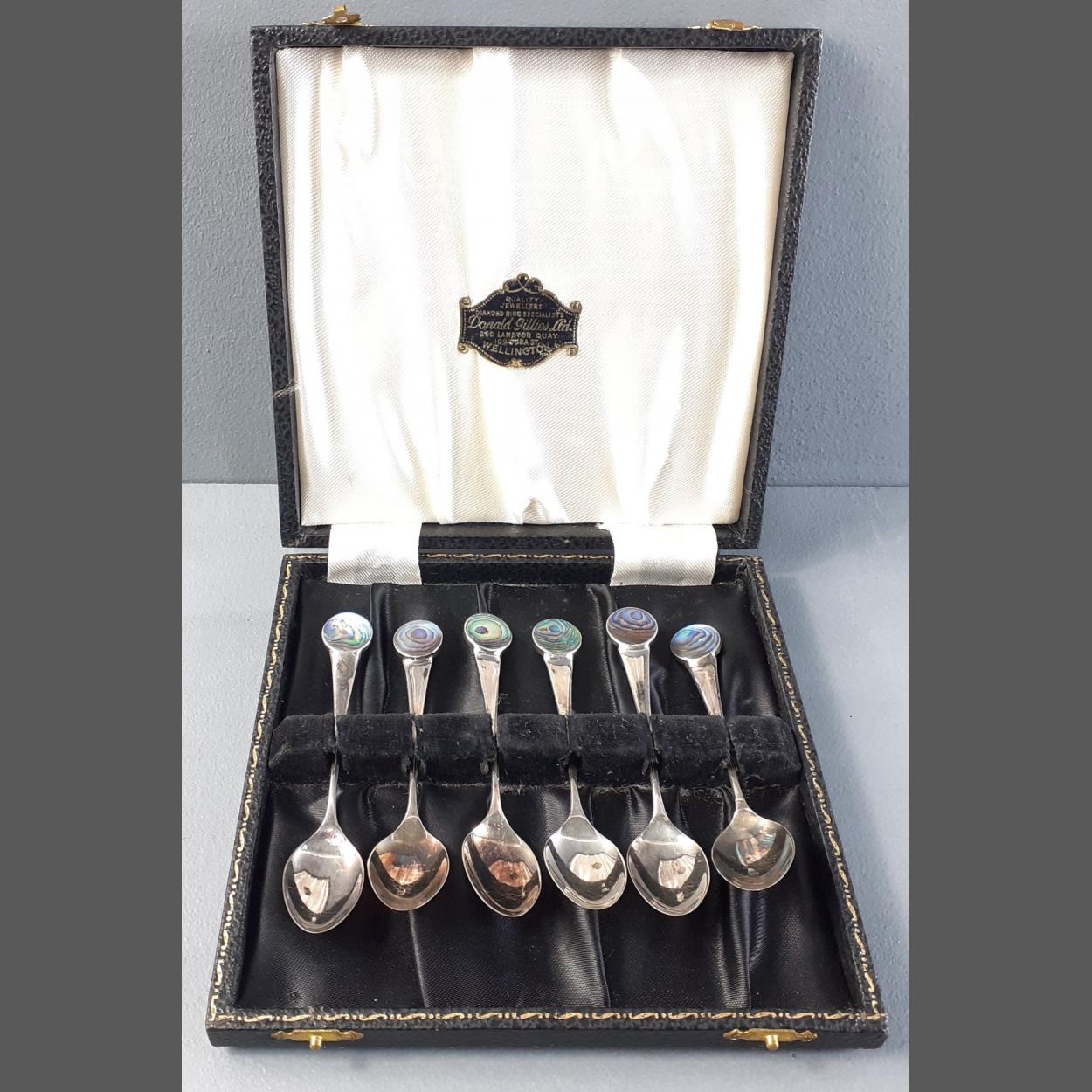 NICE QUALITY! A nice set of six white metal ABALONE handled teaspoons within their original Wellington presentation case