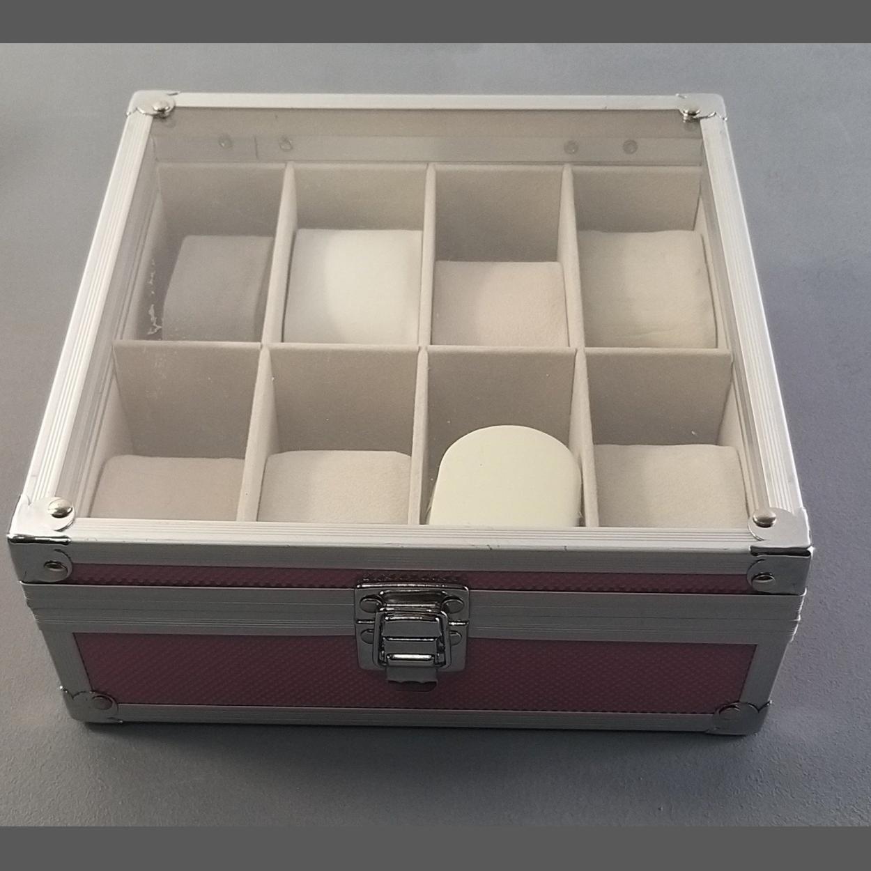 Good watch storage case with eight sections. Complete with mixed cushions. Working clasp.
