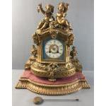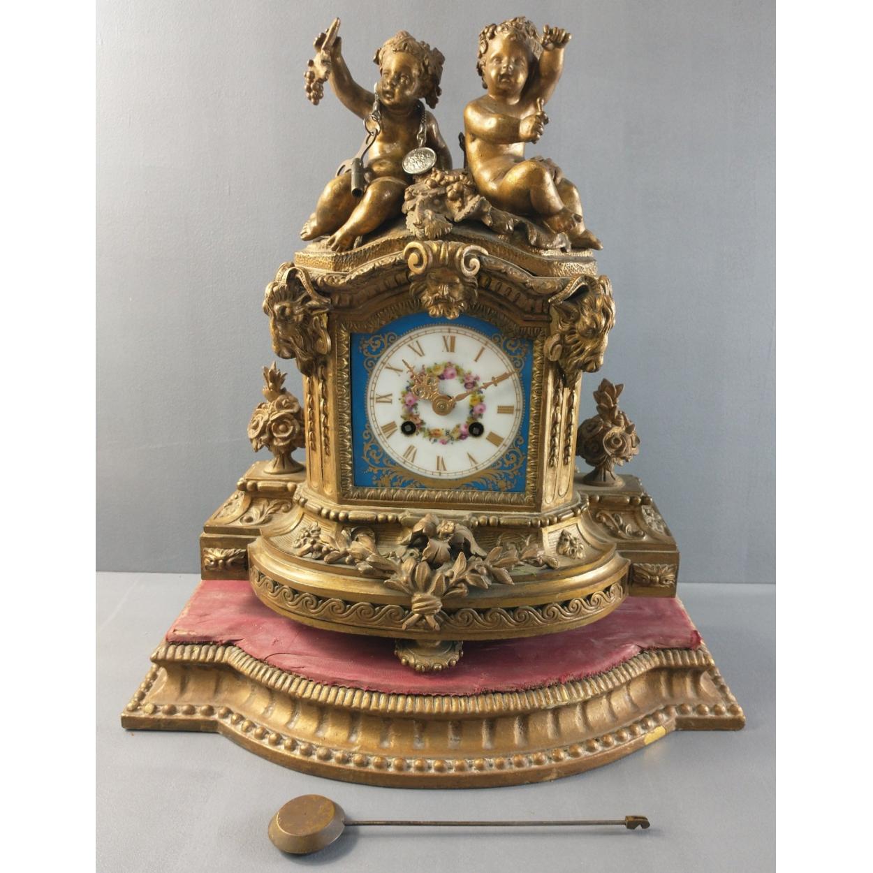ANTIQUE Atlas French mantle clock in gilded bronze and brass adorned with floral decoration - dimensions 40cm height x 30cm width - hour hand broken in half otherwise on inspection looks OK - clock has its key, pendulum is outwith the clock - clock is untested for working