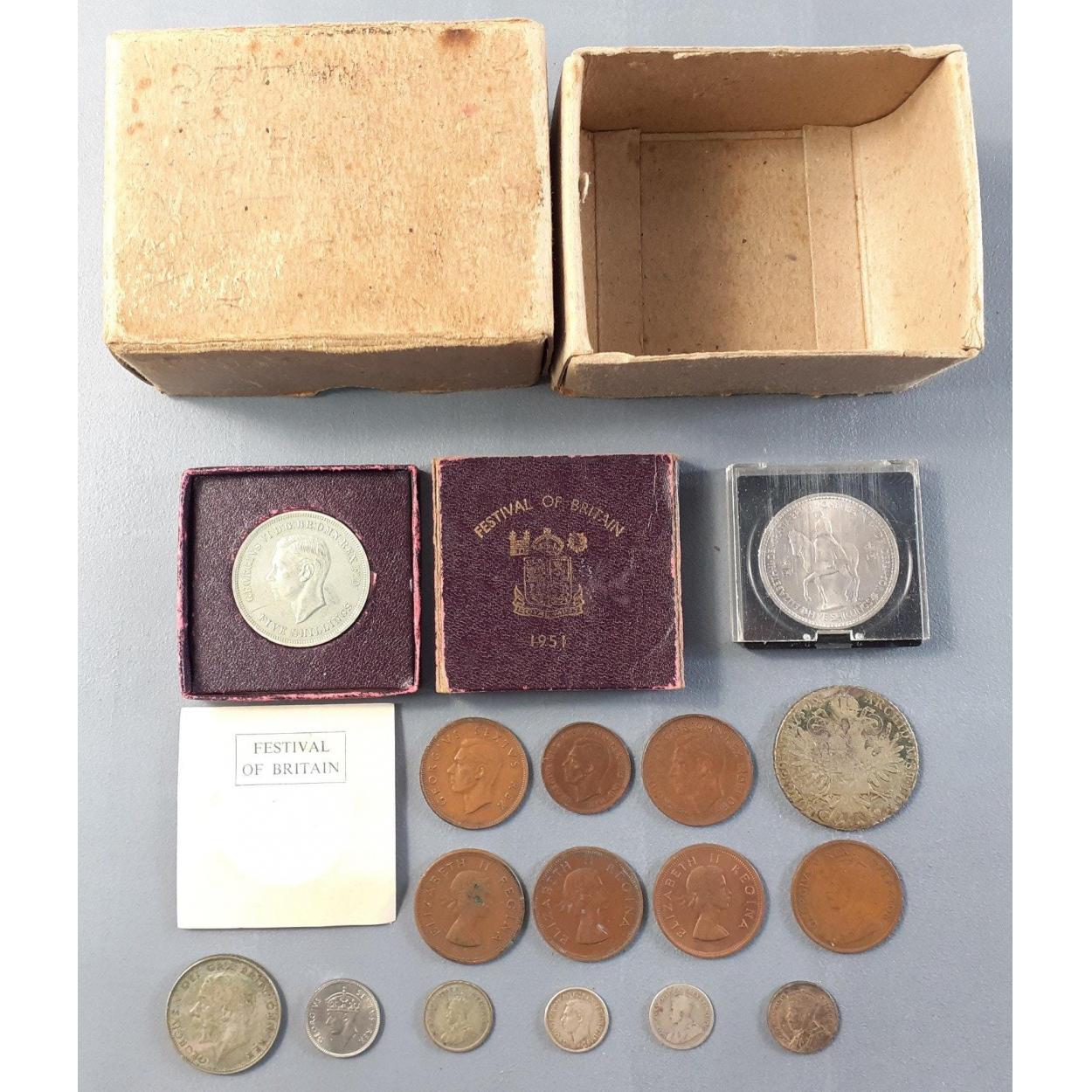 Small collection of coins of interest to include 1951 crown in box, a Marie Theresa Thaler and others.