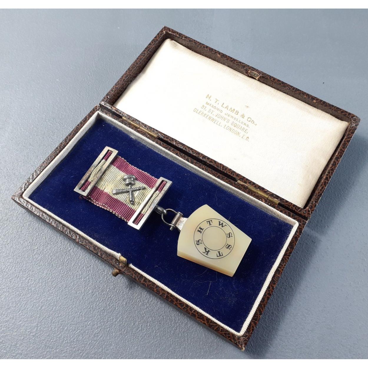 A vintage MASONIC Master Mason key stone fob medal / breast jewel in Lamb & Co. of London case.