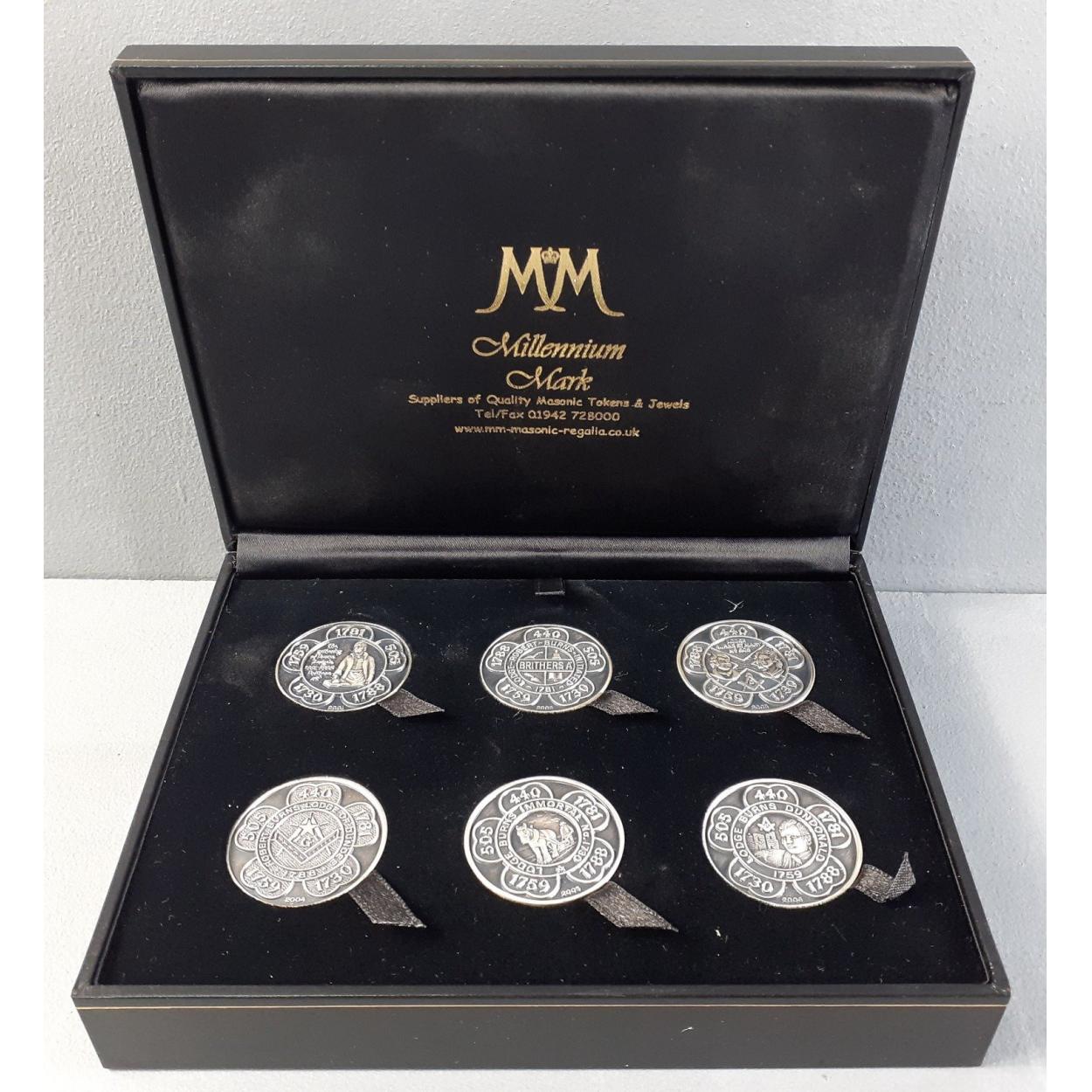 MM Millennium Mark six MASONIC token set in presentation case. In good condition complete with slip case.