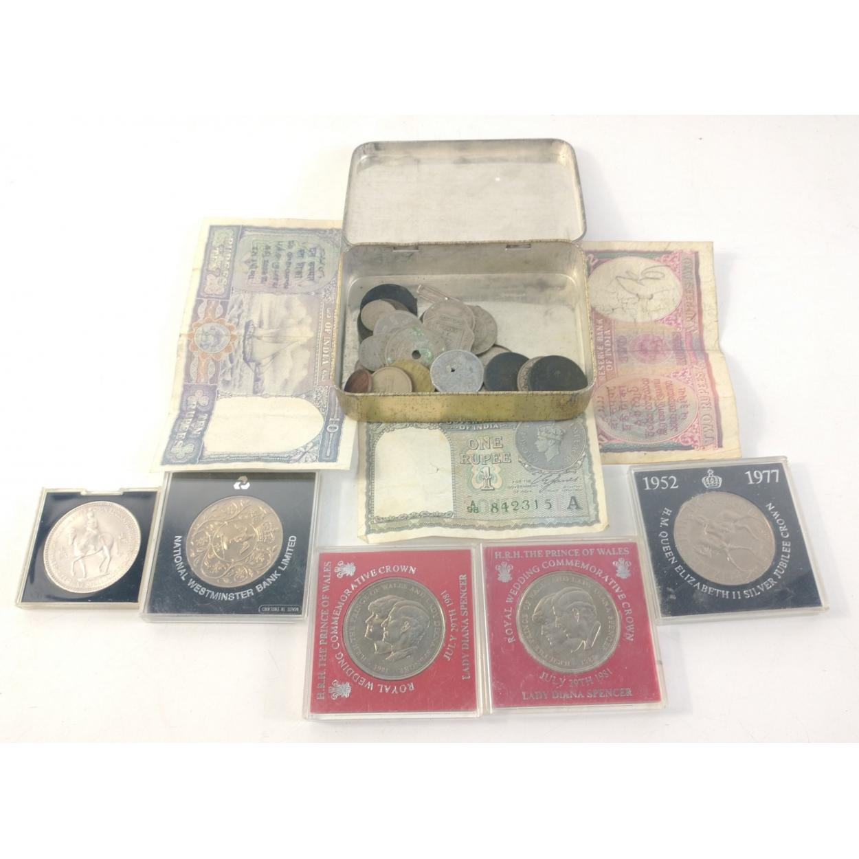 A small quantity of world coins of interest and three India banknotes. Includes a couple of coins with silver content