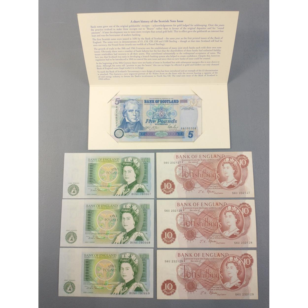 BANK OF SCOTLAND 1995 Presentation £5 Banknote in folder. First issue AA note. Also three BoE Ten Shilling sequential Fforde notes, comes with three BoE £1 sequential notes. A nice little group all in good clean crisp order.