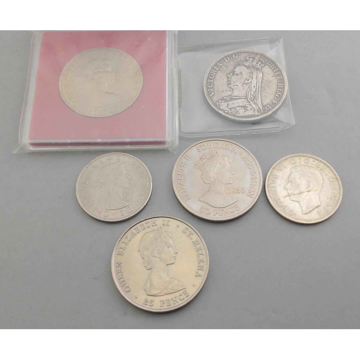 A small collection of coins to include an 1890 Victoria crown, a 1943 half-crown, a 1984 St Helena 50 pence, 1980 St Helena 50 pence and 25 pence