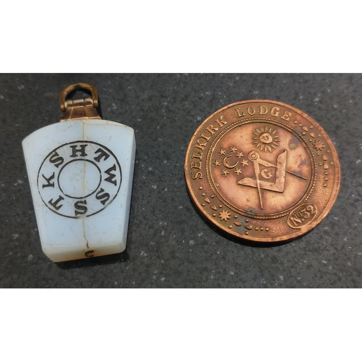 A MASONIC penny and a ROYAL ARCH KEYSTONE double sided Masonic fob