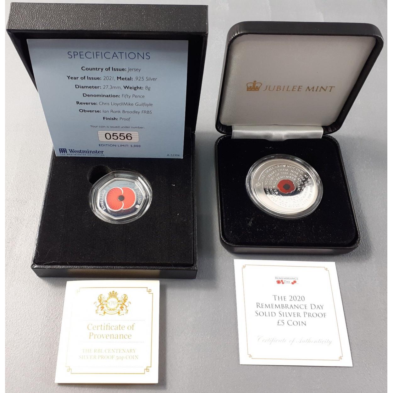 Two SILVER PROOF cased Poppy coins. 2021 Jersey fifty pence and a 2020 Alderney £5