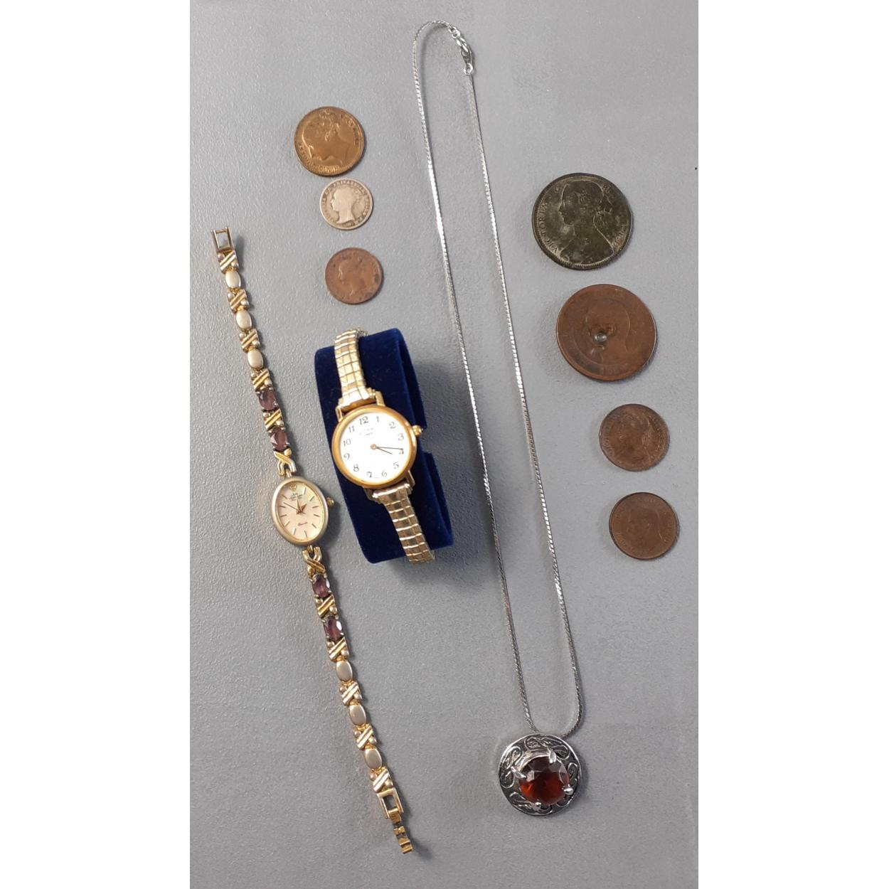 An 1854 Queen Victoria young head silver groat, fourpence 4d, sterling silver coin, with a NAPOLEON III 1853 dix centimes coin and others with a ladies Rotary watch and one other