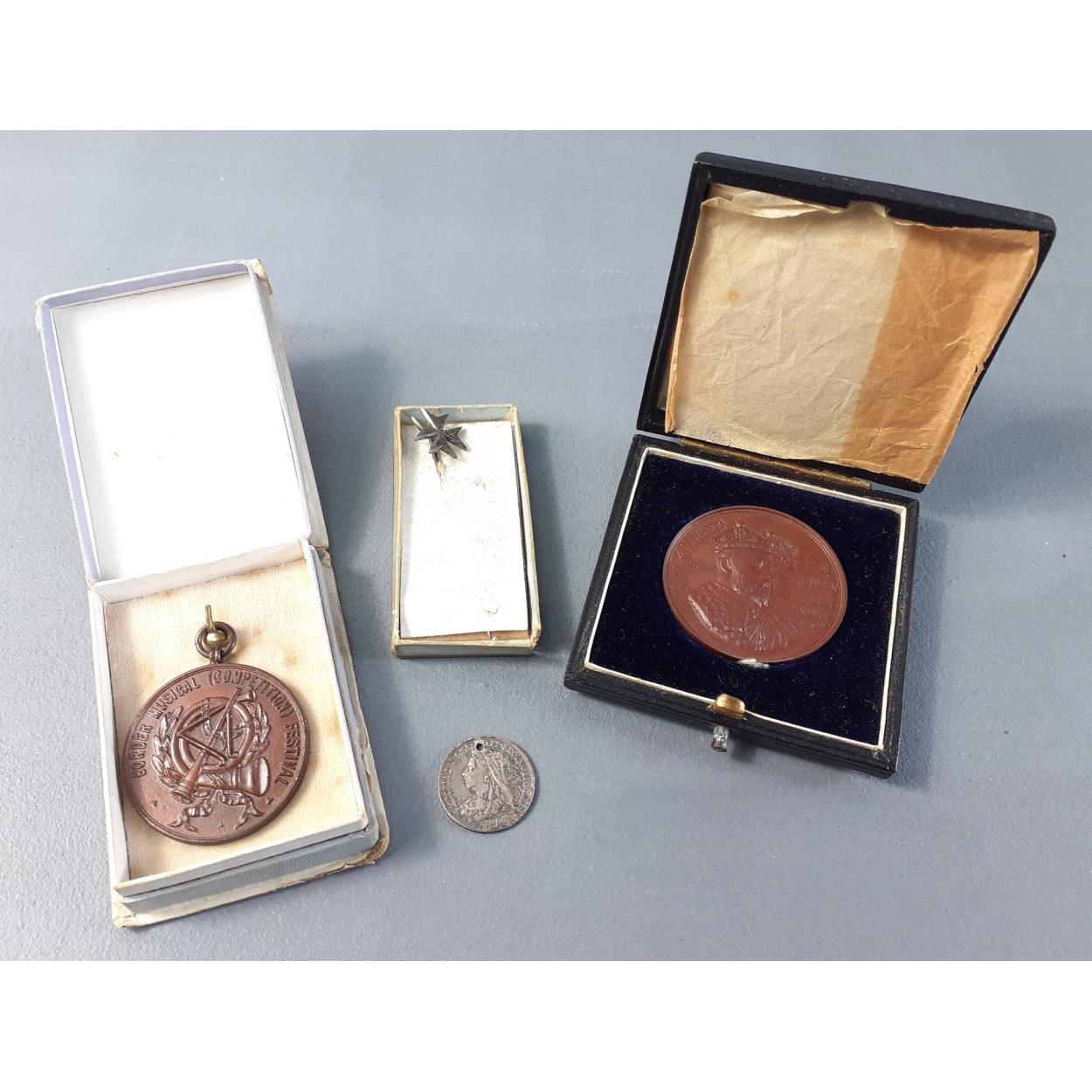 A KING EDWARD Vll and Queen Alexandra Coronation medal 1902 still in original presentation box with a piano forte medal 1920 and a vintage tie-pin silver coin/pendant and a silver medallion