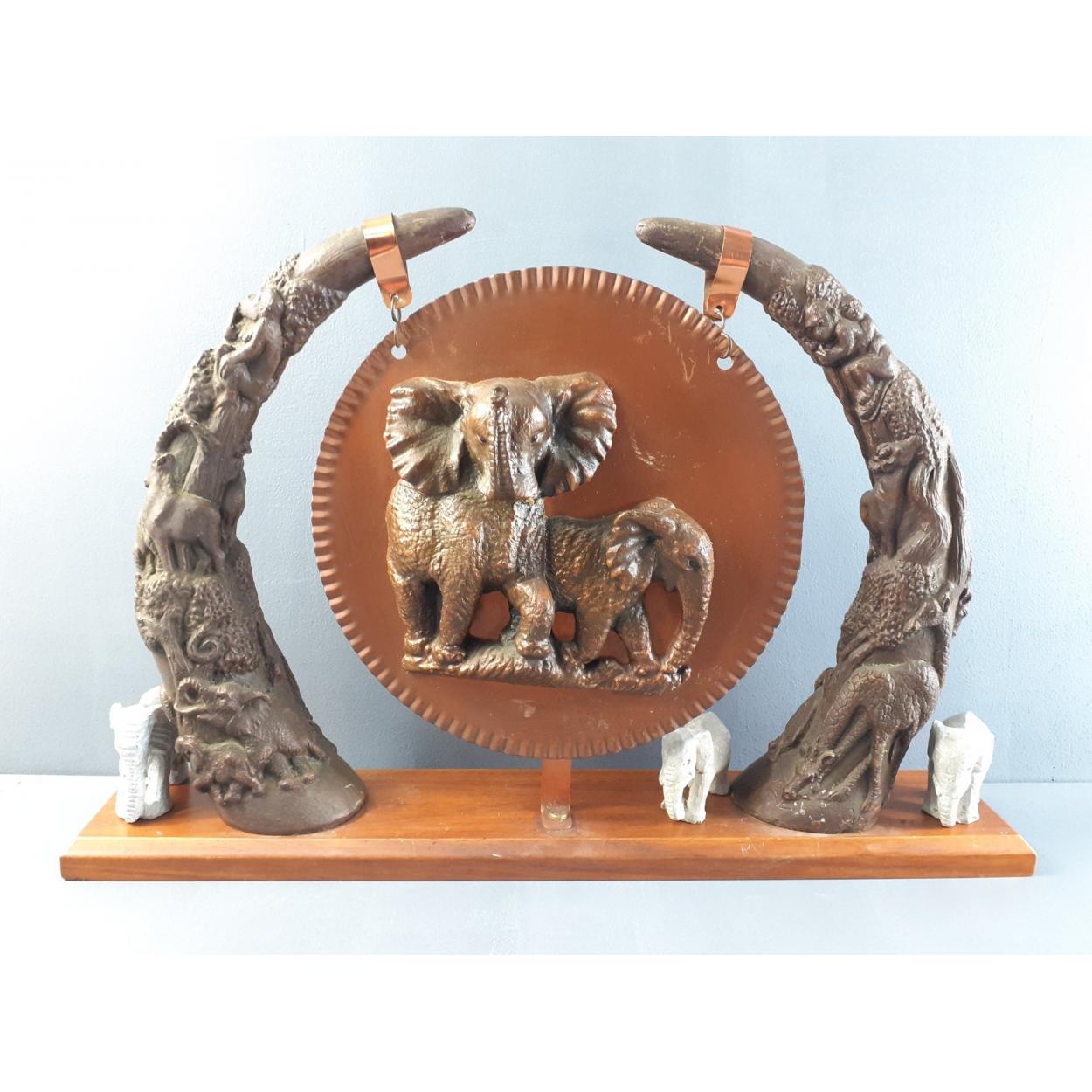 A modern mounted plaque with elephants set with wooden tusks and soap stone models to base. 45cm at base.