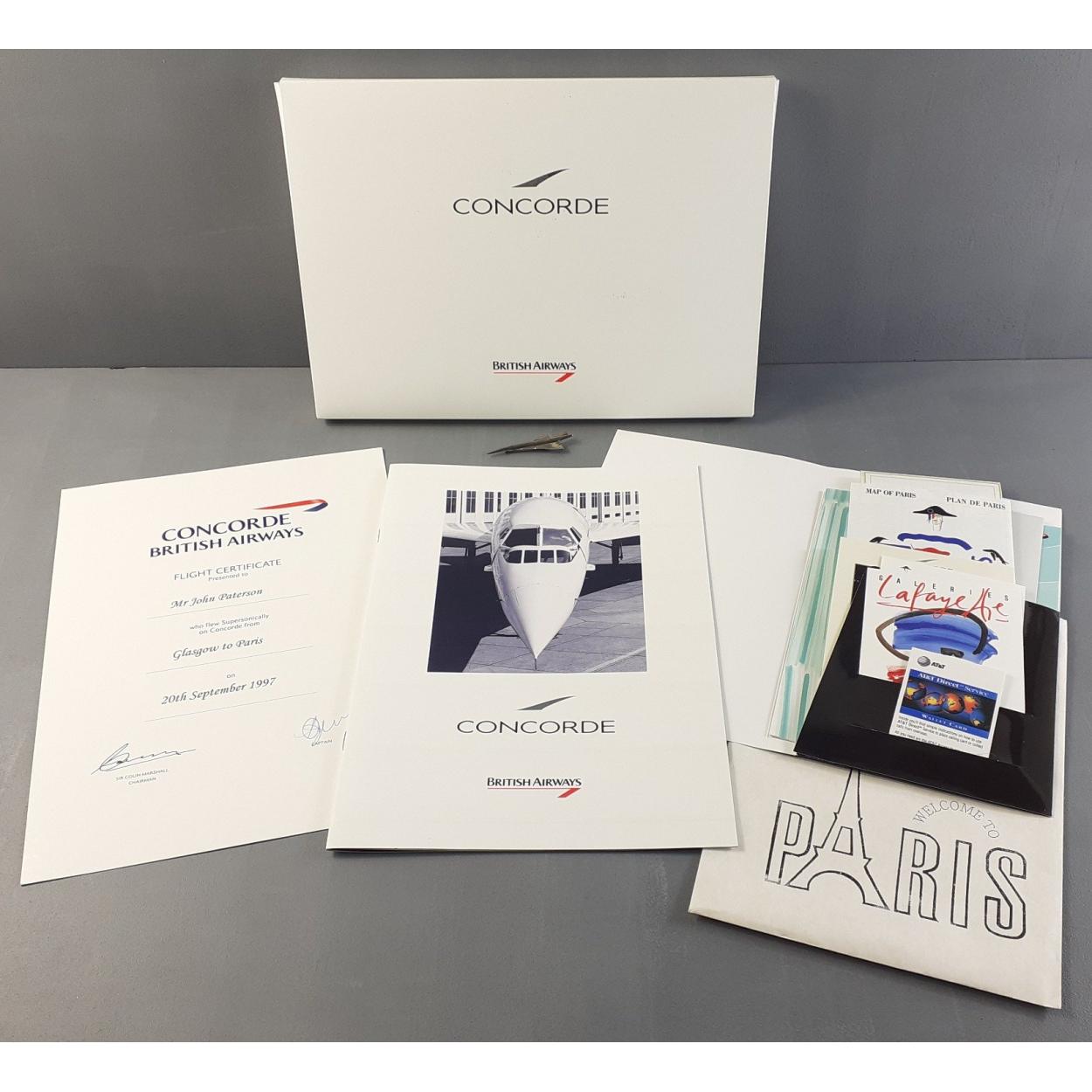 CONCORDE memorabilia. A flight folder commemorating a flight from Glasgow to Paris in 1997 including tickets, luggage tag etc. Also includes a stylish CONCORDE sterling silver pin.