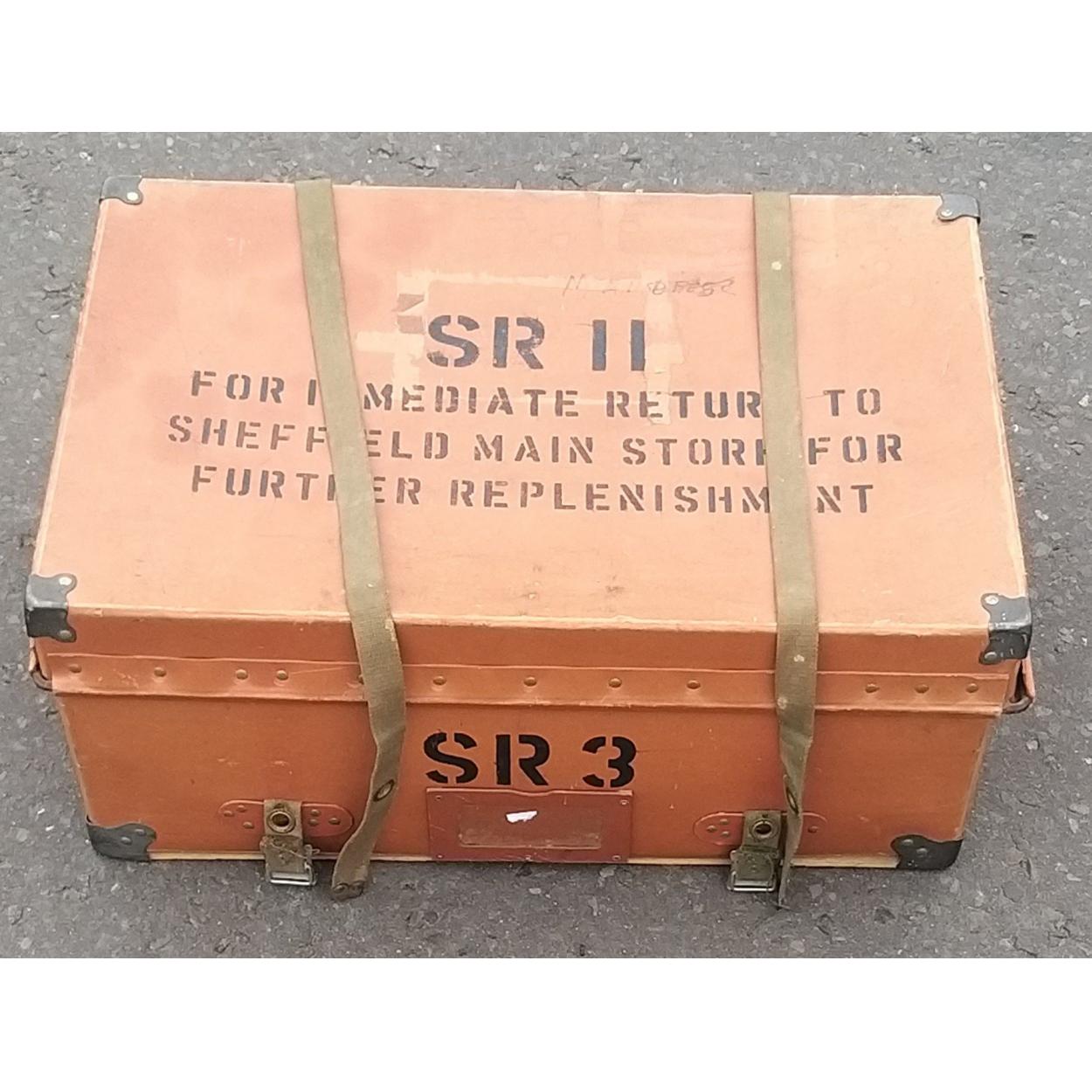 A VINTAGE lidded trunk with 'SRll for immediate return to Sheffield Main Store for further replenishment' - some sort of storage box - dimensions 62cm width x 42cm depth x 27cm height approx - appears in nice condition!