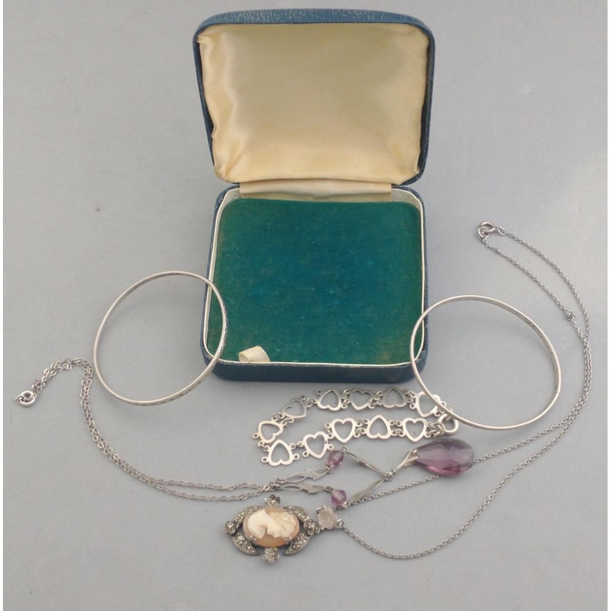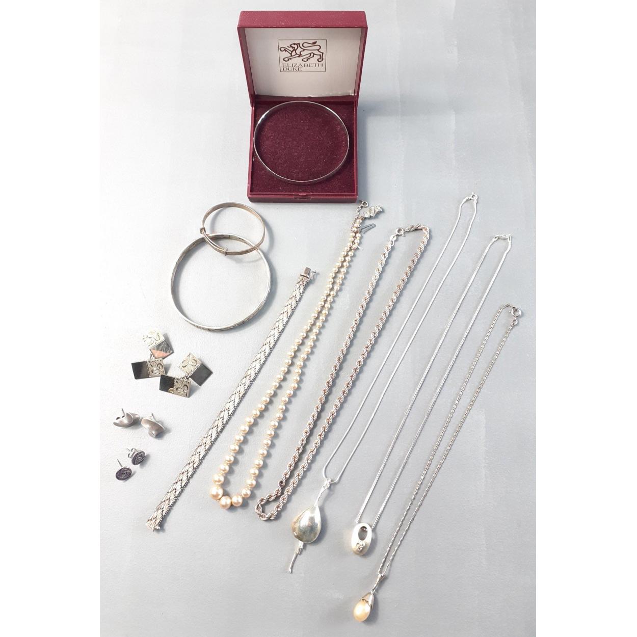 A 925 or sterling marked silver jewellery lot to include pearls with silver clasp, bangles, pendants etc. Gross weight without the pearls 90g approx.