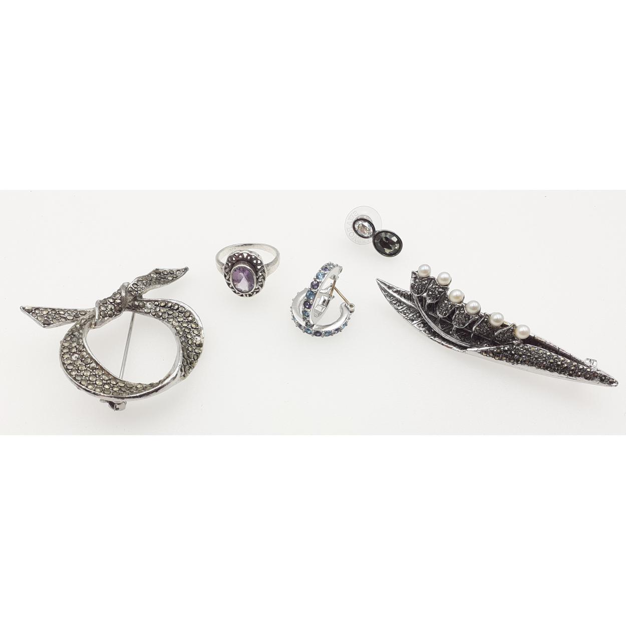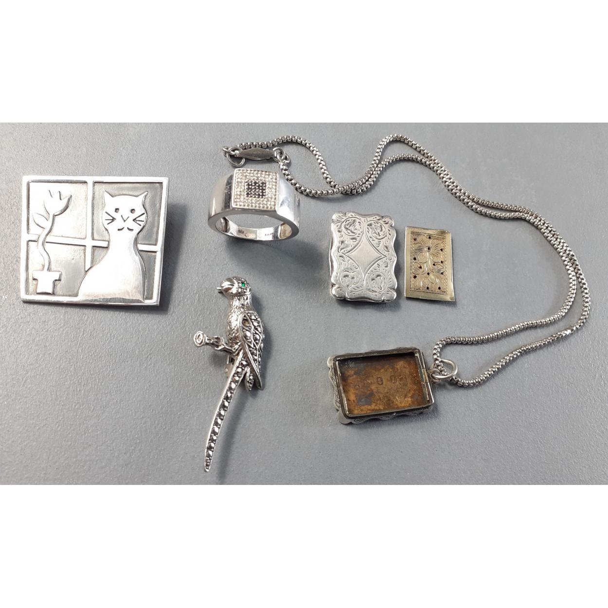 A small silver jewellery collection to include sterling stamped cat at window brooch, sterling stamped marcasite parrot brooch, 925 AFFY stamped size R ring with diamond chips and a hallmarked vinaigrette A/F with applied ring and chain and detached lid. Total gross weight 30g approx.