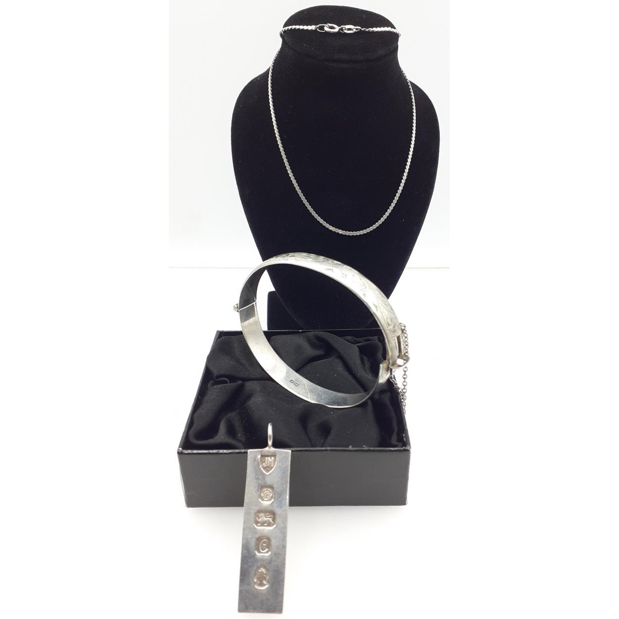 UMM A small collection of silver jewellery to include a hallmarked bangle, 40cm and a 1977 hallmarked ingot. Gross weight 47.2g approx