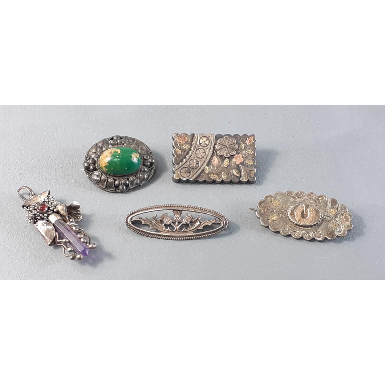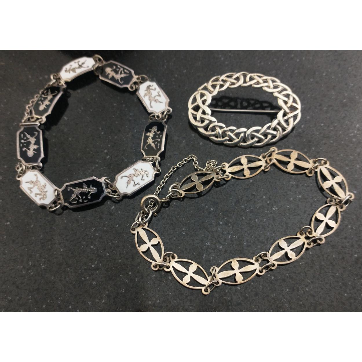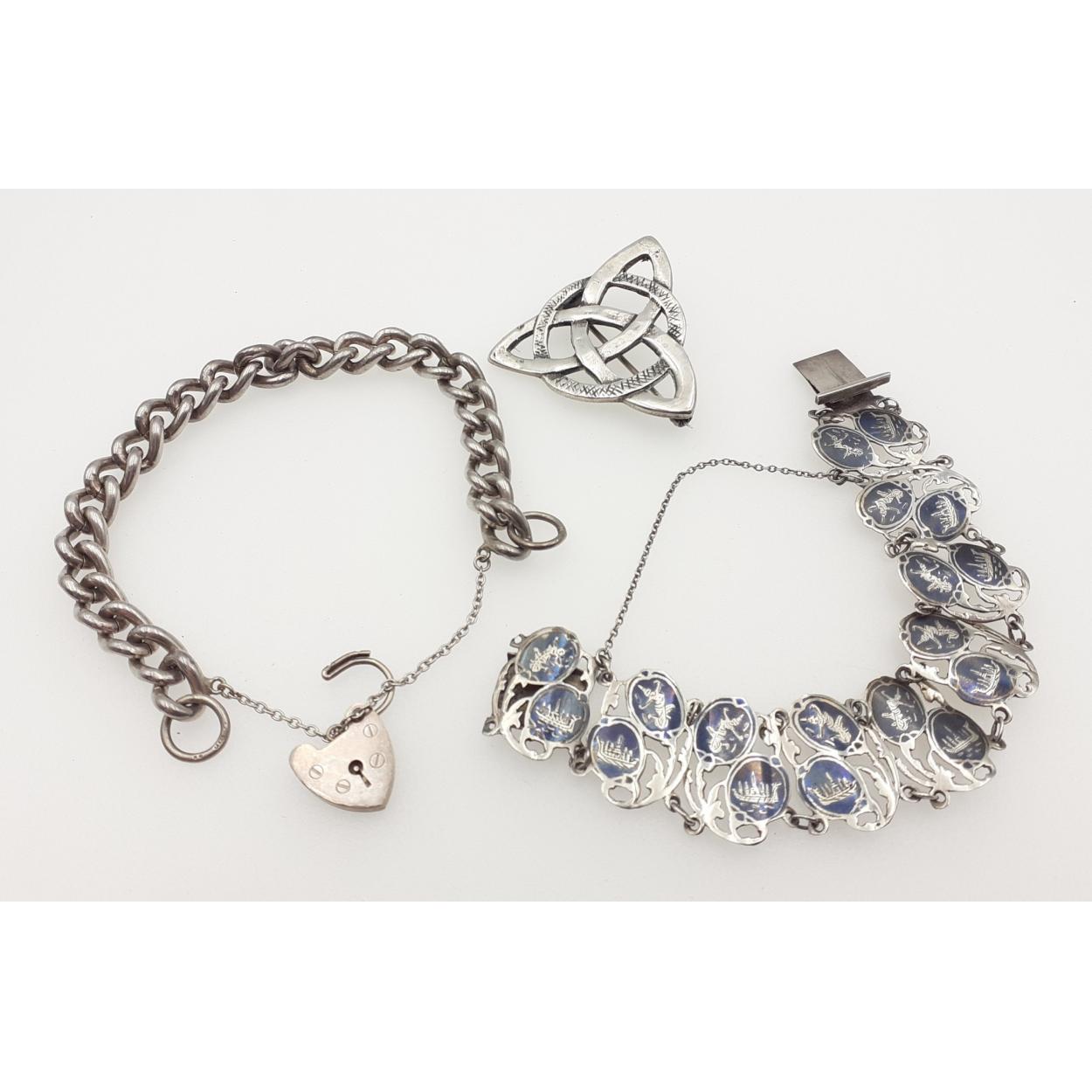 A silver collection of jewellery to include a Celtic knot brooch with Edinburgh hallmarks, Thai silver bracelet and a silver bracelet with lock. Total gross weight 67.5g approx.